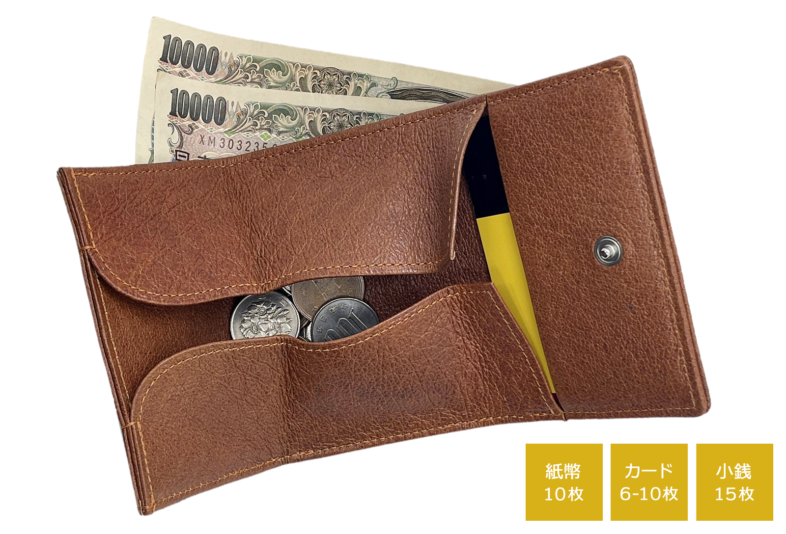 紙幣約10枚、カード6~10枚、小銭約15枚程度を収納する、考え抜かれた使用感で抜群の使い易さを実感できます。