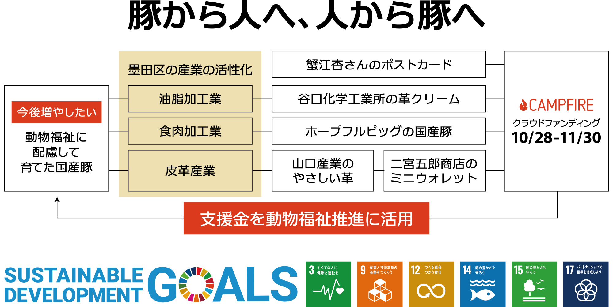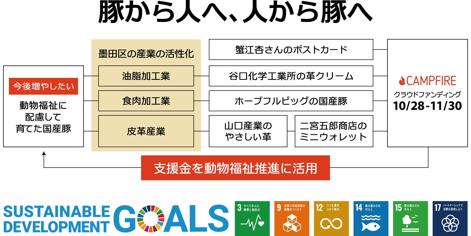 はじめまして!東京都墨田区発の「SUMIDA happy pig project(すみだハッピーピッグプロジェクト)」です!私たちはストレスフリーな環境で育てられた豚の革やお肉を消費者の皆さんに届ける活動を推進しています。