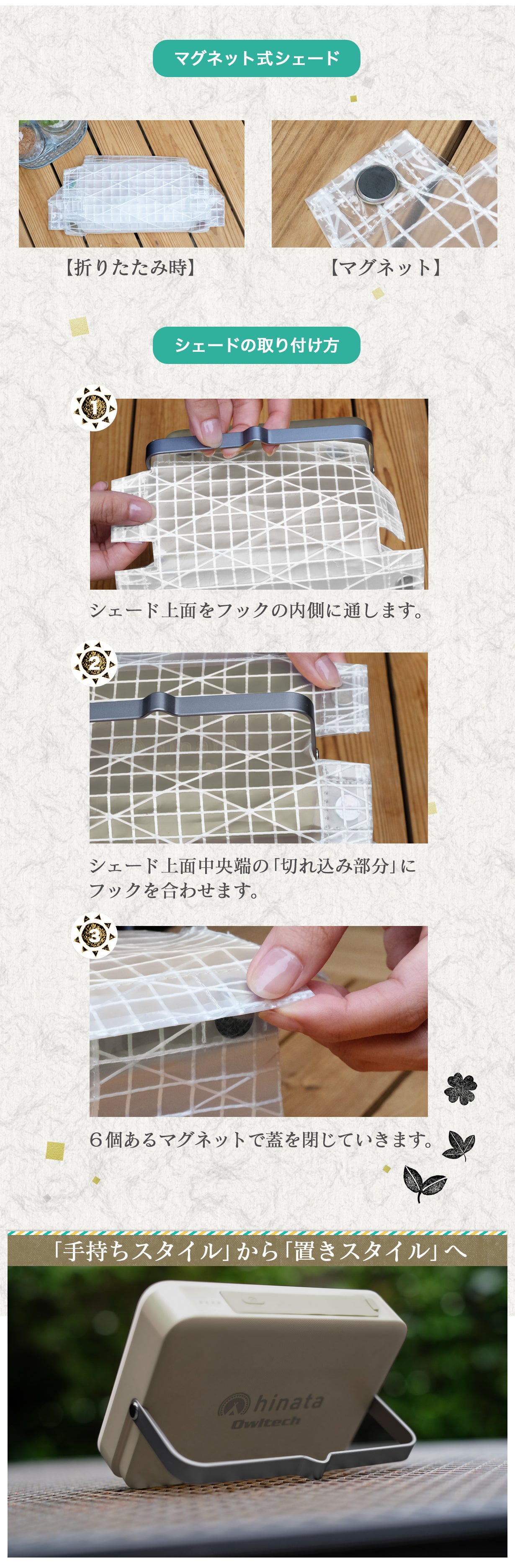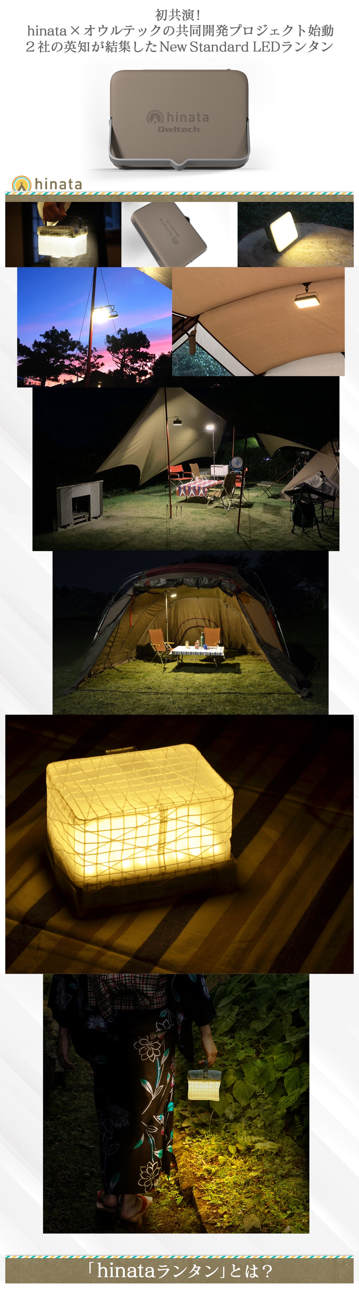 アウトドアメディアのhinataと電子機器メーカー オウルテックが共同で開発した、とっても明るく、内蔵電池は大容量の24000mAhを備えた平面型LEDランタンです。シェードを付ければ柔らかい光のインテリアライトとして、ランタンとは違った雰囲気を楽しめます。