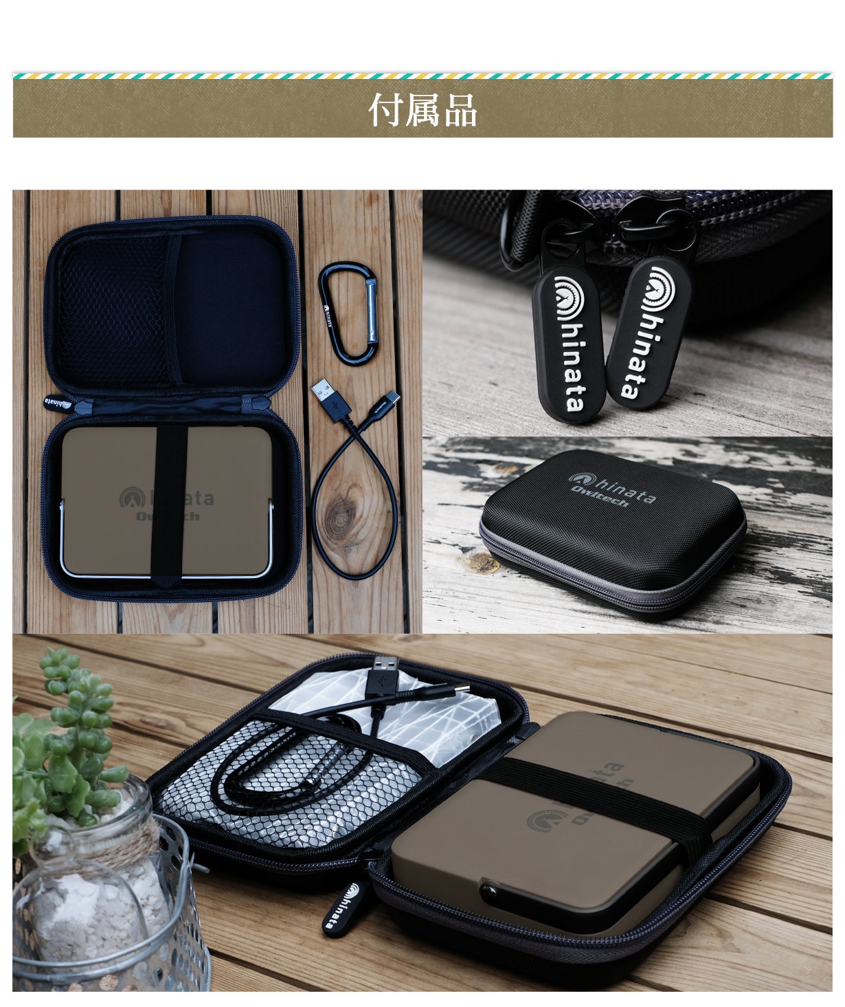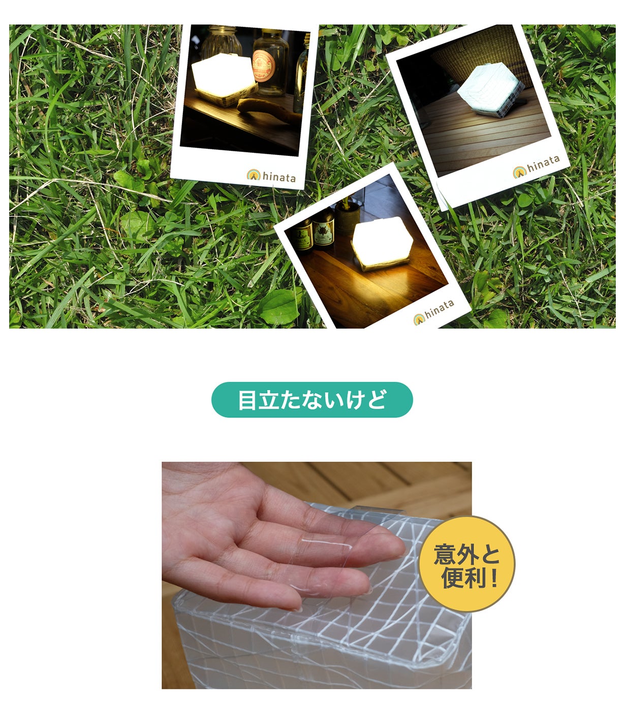 内側に付属品を収納できる『hinata特製ハードケース』、雰囲気作りに最適な『ランプシェード』、ランタンフックのないテント内やガイロープにも吊り下げ可能な『カラビナ』、取り回しやすい長さの『充電ケーブル』を標準セットにしました。