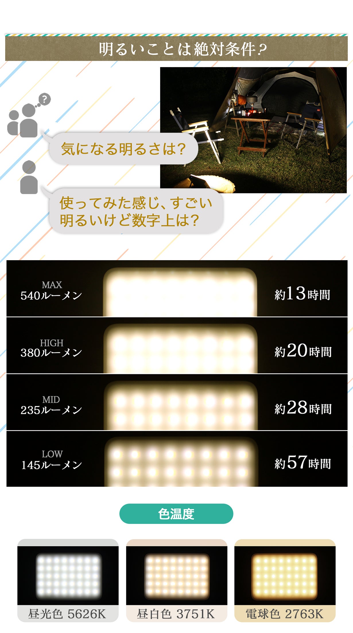 点灯時間:約13時間(最大光量時)、約57時間(最小光量時)