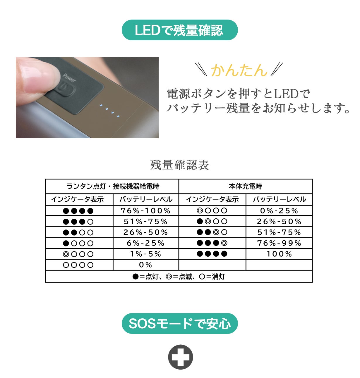 電源ボタンを4秒間長押しすると、SOS点滅モードに入ります。万一の体調不良や緊急事態時にライトが点滅し、とても役に立ちます。