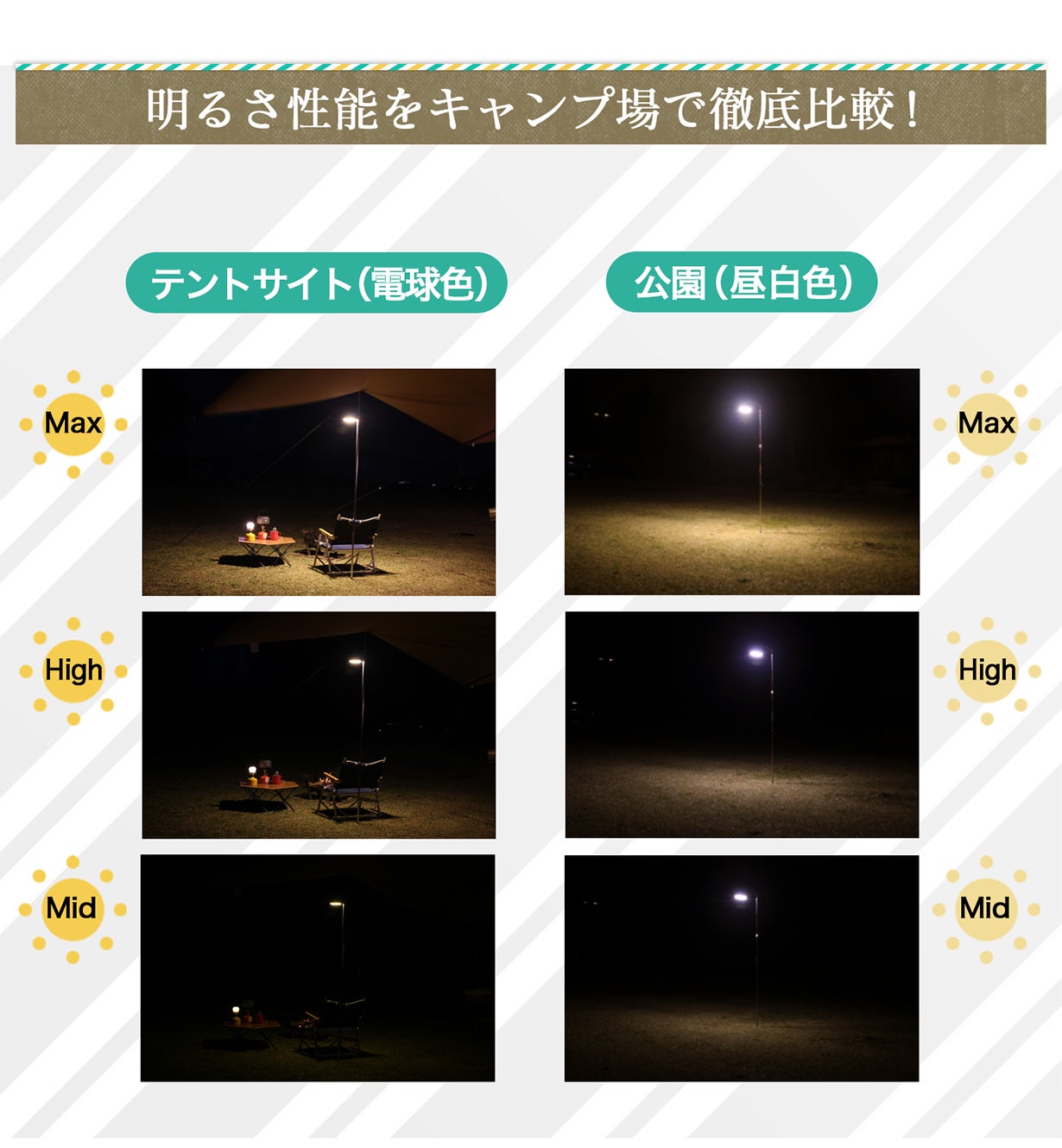 hinataランタンは、暗いキャンプ場でも十分な明るさがあり、540ルーメンでも芝生の状態や芝目がクッキリ確認できます。