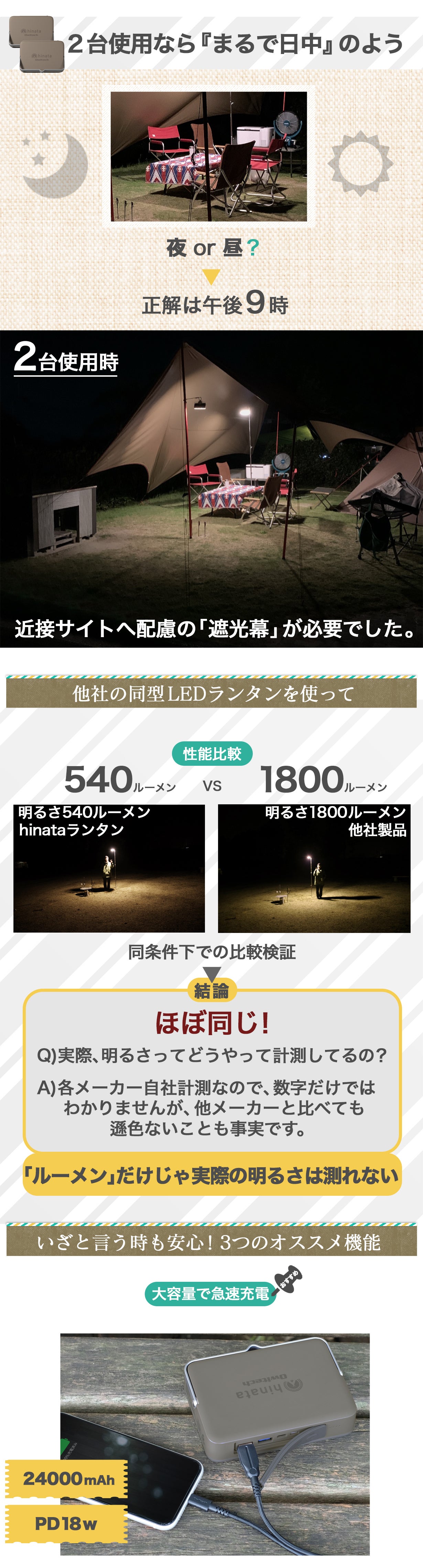 春夏秋冬キャンプに行っています。何度も何度もこのhinataランタンをキャンプ場に持ち込み、繰返しテストを行って来ました。明るくて使いやすくて、ちょっと目立ちます。是非皆さんもお試しください!