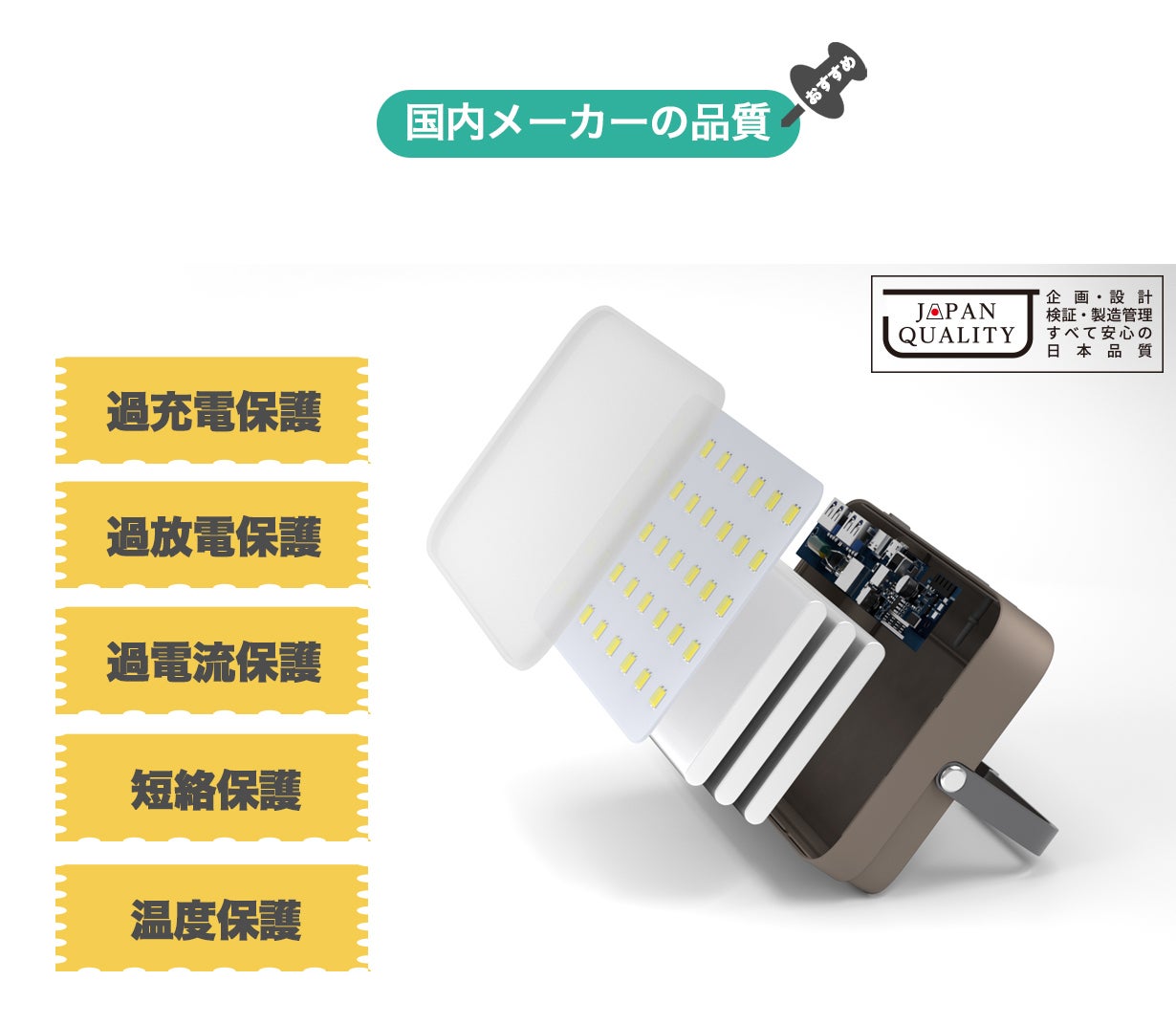 大容量バッテリーを搭載しているからこそ、保護性能を最重視しています。過充電保護/過放電保護/過電流保護/短絡保護/温度保護を搭載。安心の国内メーカーだからできる各種検証を重ね製品化しています。また、安心・安全のPSE適合製品です。
