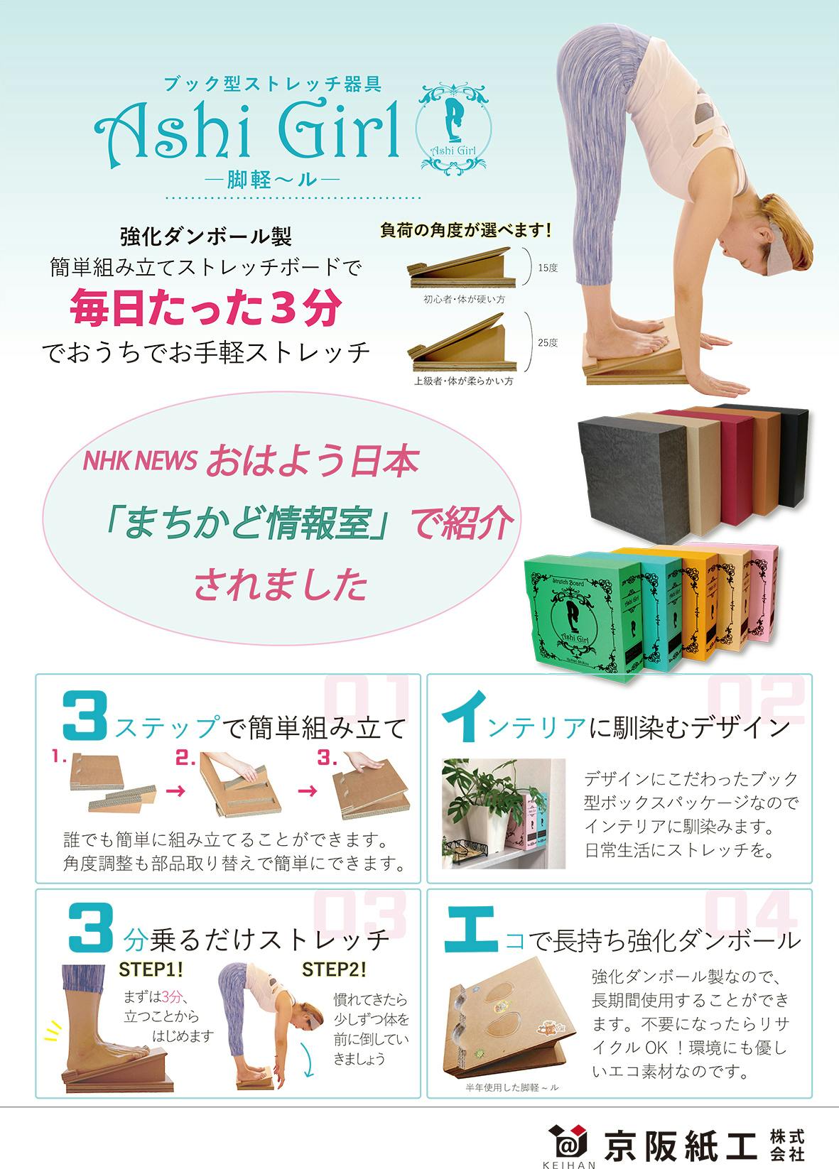 『Ashi Girl(脚軽~ル)』は、従来の健康器具に対する、「部屋の中で場所を取ってしまい、片付け場所にも困る」、「プラスチックや樹脂製の商品が多く、使わなくなった際の処分にも手間がかかる」、などのお悩みを解決したいという思いから生まれた、強化ダンボール製のストレッチボードです。