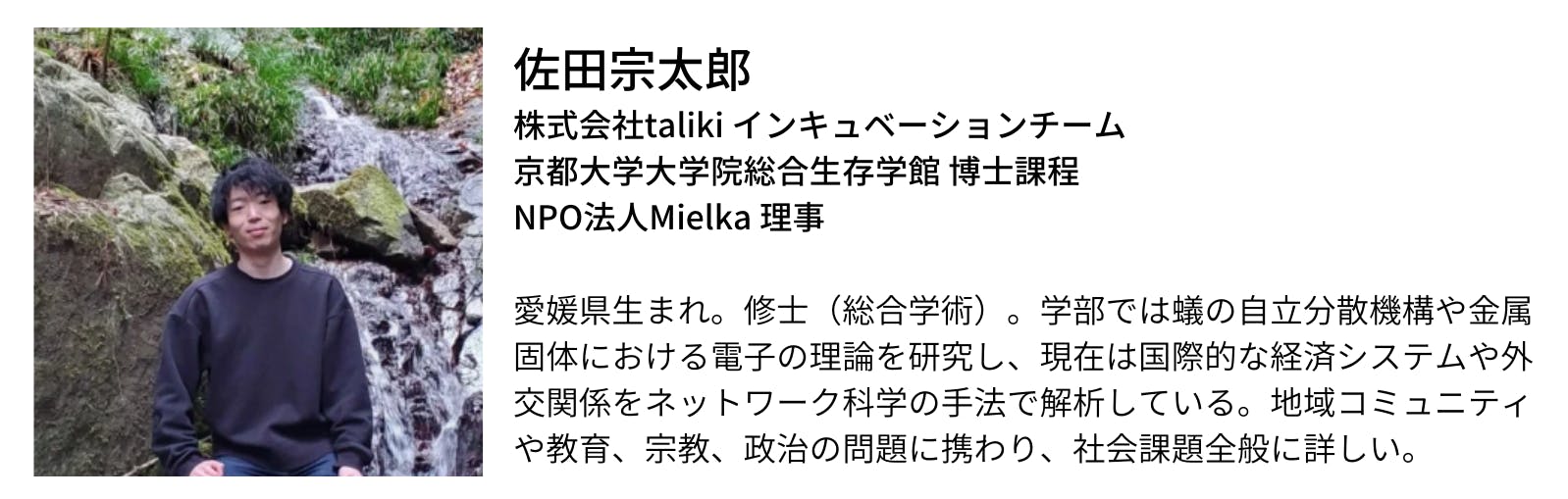 1995年生まれ。京都大学在学中に国際協力団体の代表としてカンボジアに2校の学校建設を行う。その後、ニューヨークのビジネススクールへ留学。現地報道局に勤務し、アシスタントプロデューサーとして2016年大統領選や国連総会の取材に携わる。様々な経験を通して「社会課題を解決するプレイヤーの支援」の必要性を感じ、帰国後の大学4年時に株式会社talikiを設立。関西を中心に社会起業家のインキュベーションや上場企業の事業開発・オープンイノベーション推進を行いながら、2020年には社会課題解決ファンドを設立し投資活動にも従事。撮影:岡安いつ美