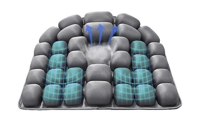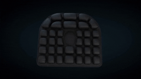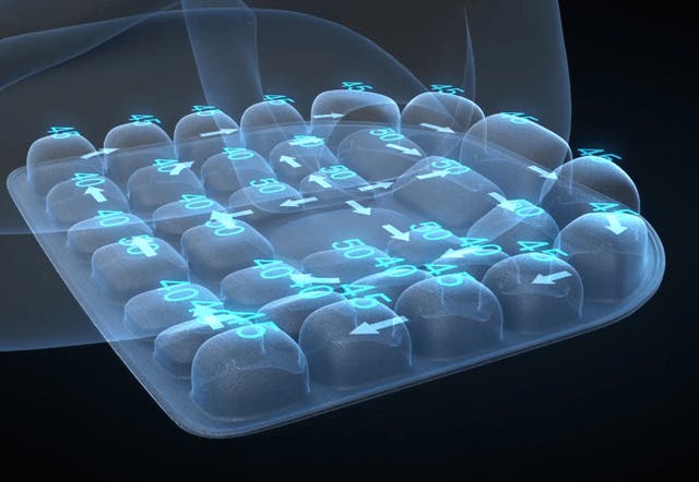 体が触れるべき部分のエアセルは小さくで低く、それ以外は大きくて高く、座ることでことで、ホップと太ももは自然と多々位置にフィットし、周りの大きいセルに優しく包まれます。