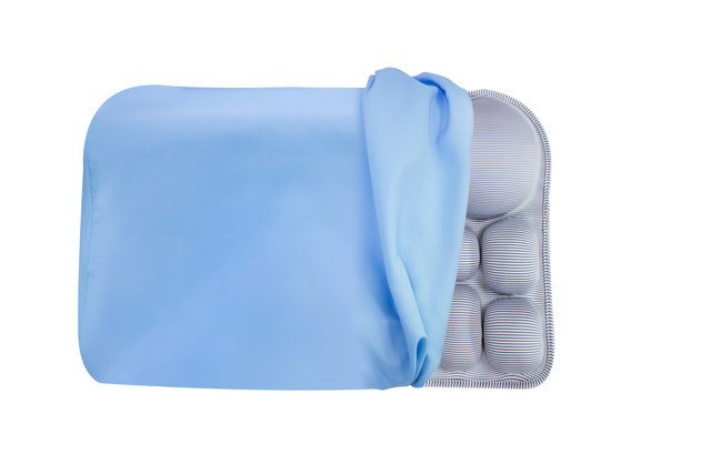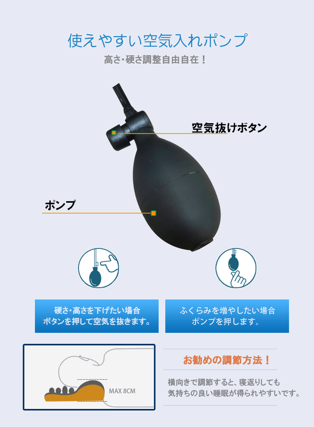 より気持ちよい睡眠を得られるよう、首から体の形を研究し、枕の曲線とエアセル一つ一つの大きさを計算し作成しました。なるべくどんな体勢でも睡眠の邪魔にならないように開発しています。
