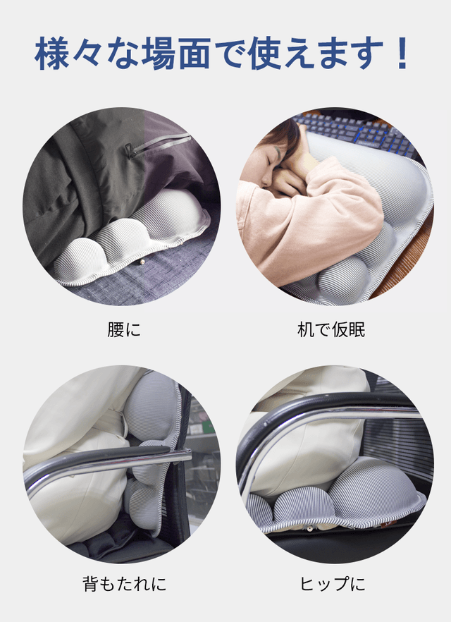 また、日常デスクワークや運転でも、椅子の背もたれやヒップクッションとして使っていただいても、体が楽になります!使い方はあなた次第です!