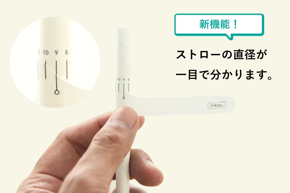 STROLL_01と同じく太さが調整できるだけではなく、固定部分に目盛りを入れることにより、ストローの直径が分かるようになりました。ストローの太さによって変わる味の感じ方をお楽しみください。また、目盛りのラインを合わせることで真っ直ぐ巻けているかのガイドの役割も果たします。