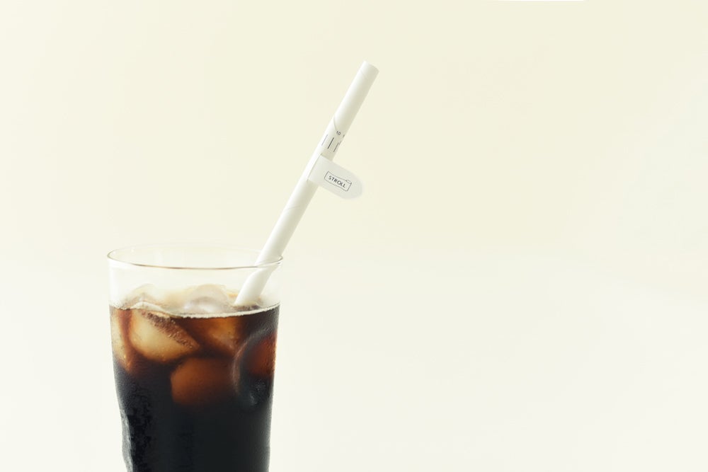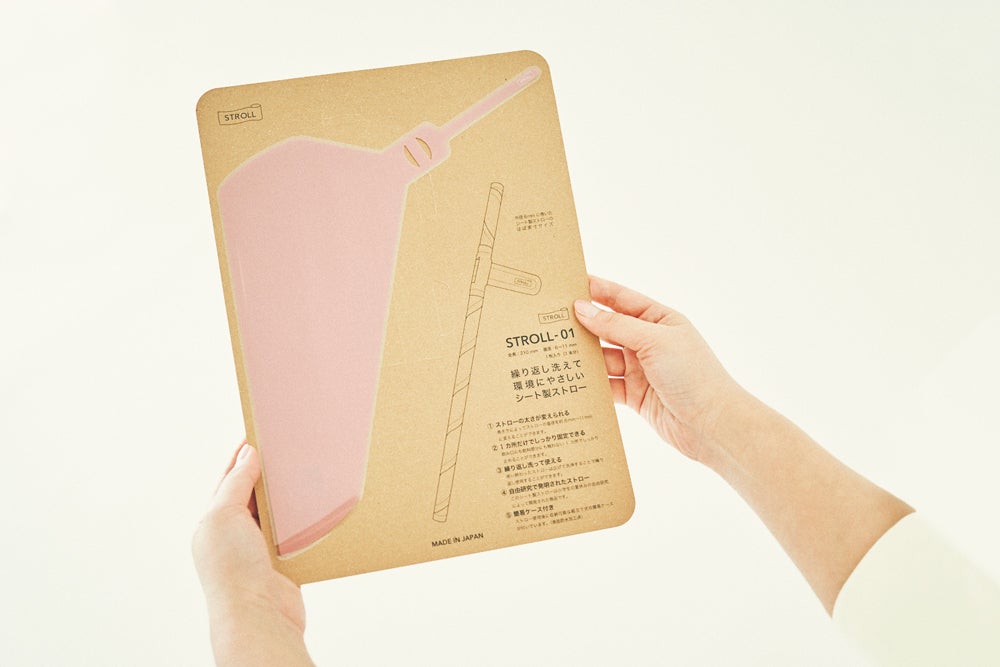 1枚のシートをくるくると巻いてつくるシート製ストロー「STROLL_01」は、素材はプラスチックですが、使い終わったら広げて洗って繰り返し何度も使用することができます。