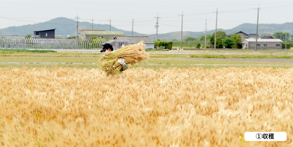 いつもはコンバインで麦わら部分を粉々に粉砕しながら収穫するところ、鎌で丁寧に収穫していただきました。これまでは麦わら部分は完全に捨てていた(土に還っていた)そうです。