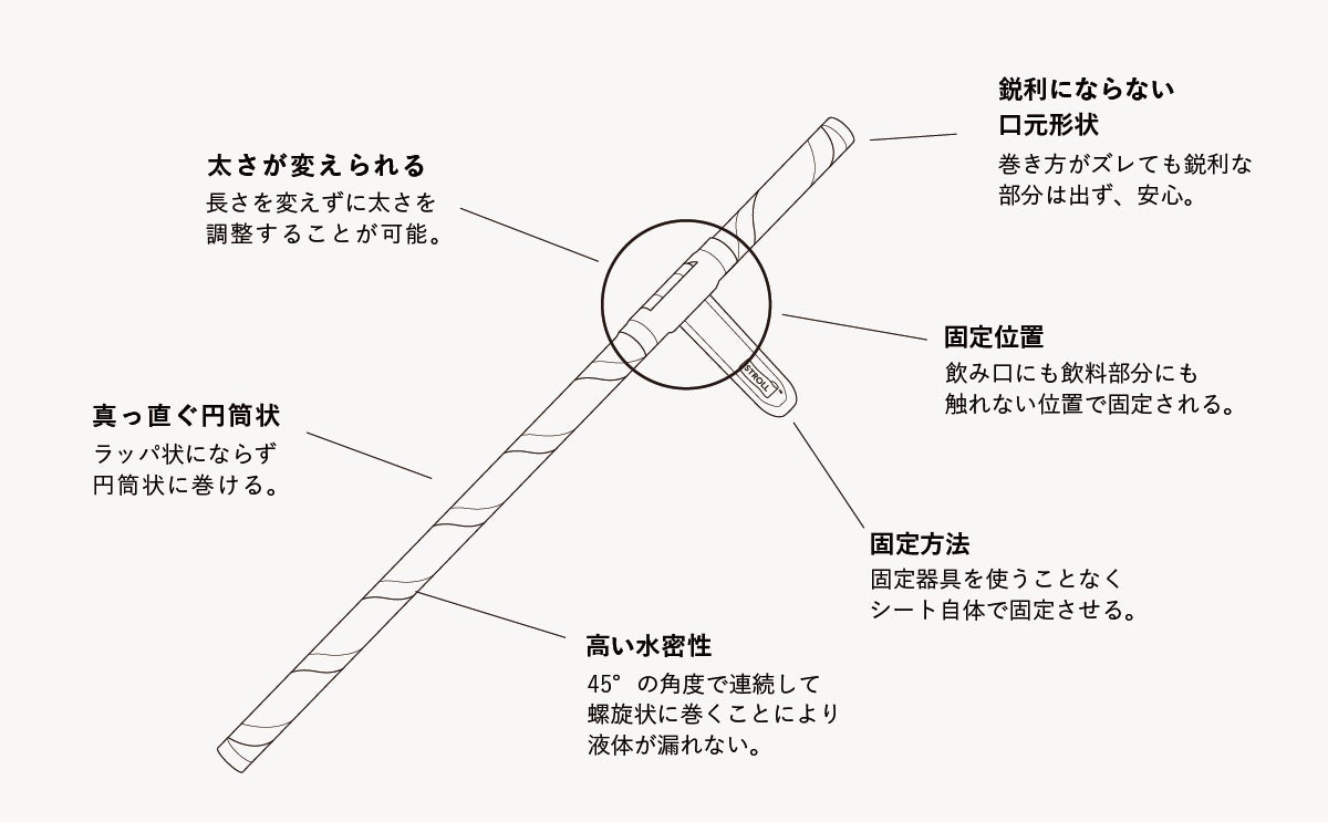 このシート製ストローの特徴は、『水密性を保ちつつ、まっすぐな円筒状になり、飲み口にも飲料にも浸からない一箇所で固定ができ、口元が鋭利にならないこと』を突き詰めたオリジナルの形状であり、特許査定をいただいています。(出願番号:特願2019-227741)
