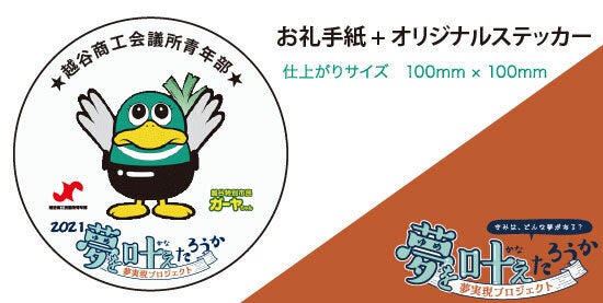 感謝状 + オリジナルステッカー(非売品:10枚) + オリジナル手ぬぐい(非売品:10枚) + オリジナルせんべい(15枚) + オリジナルお菓子(7種) + 青年部ホームページPR広告掲載(大枠) + 夢実現のドキュメントDVD1枚進呈 + 夢実現のドキュメントDVDに社名(または個人名)掲載 + 青年部広報誌に社名(または個人名)掲載 + 夢実現の現場見学招待(夢実現の内容が決定次第、場所や日時はご相談させて頂きます)