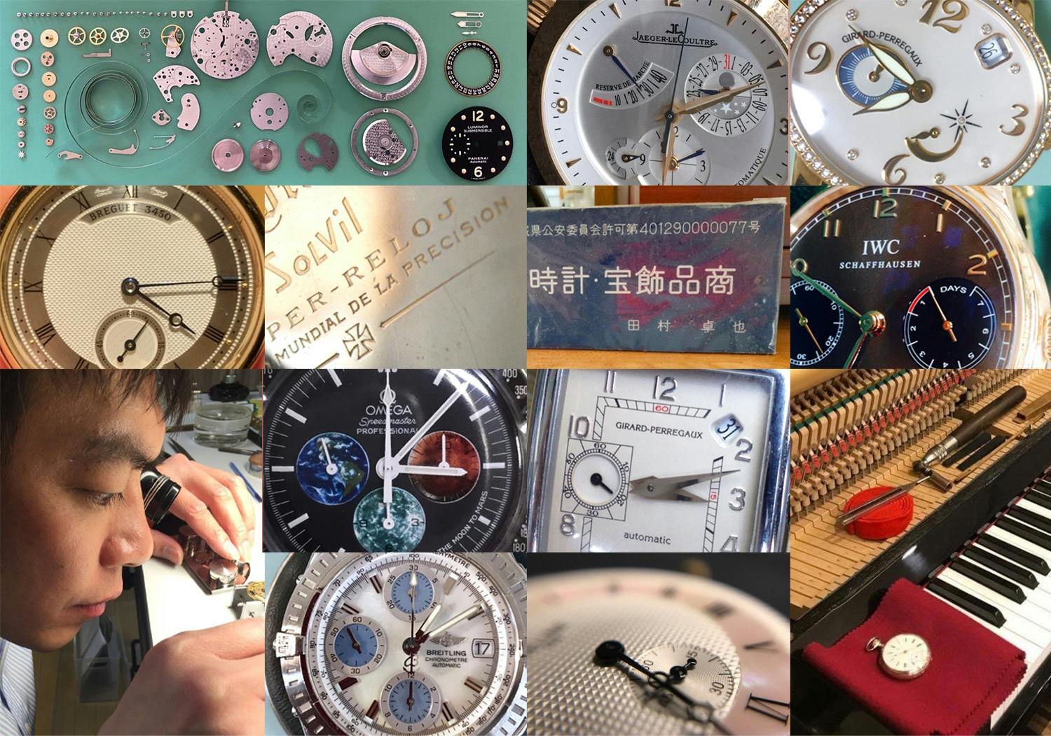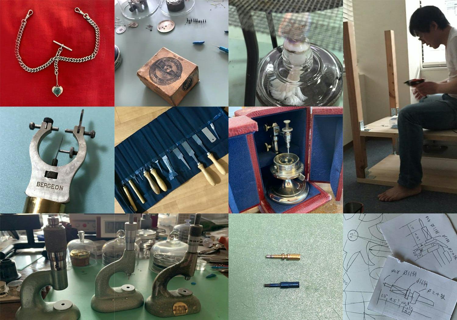 現行品の時計と共に、舶来のアンティークやユーズドを軸に「パーツ供給終了」でメーカー修理不可や古すぎてメーカーが廃業してしまった時計のOH、修理・修復を生業にしてきた。約150年前のミニッツリピーター(複雑式時計)、マニュアルのない古い時計から修理に必要となる工具づくりまで。海外からの買い付けやオークション、自主作製。その時計に沿った年代の工具と技術を用い、0.01mmの世界に生き、ネジ一本・バネ一本から作製。肩書きに重みを付ける筈の「資格を一切持たない」孤高の天才技師。