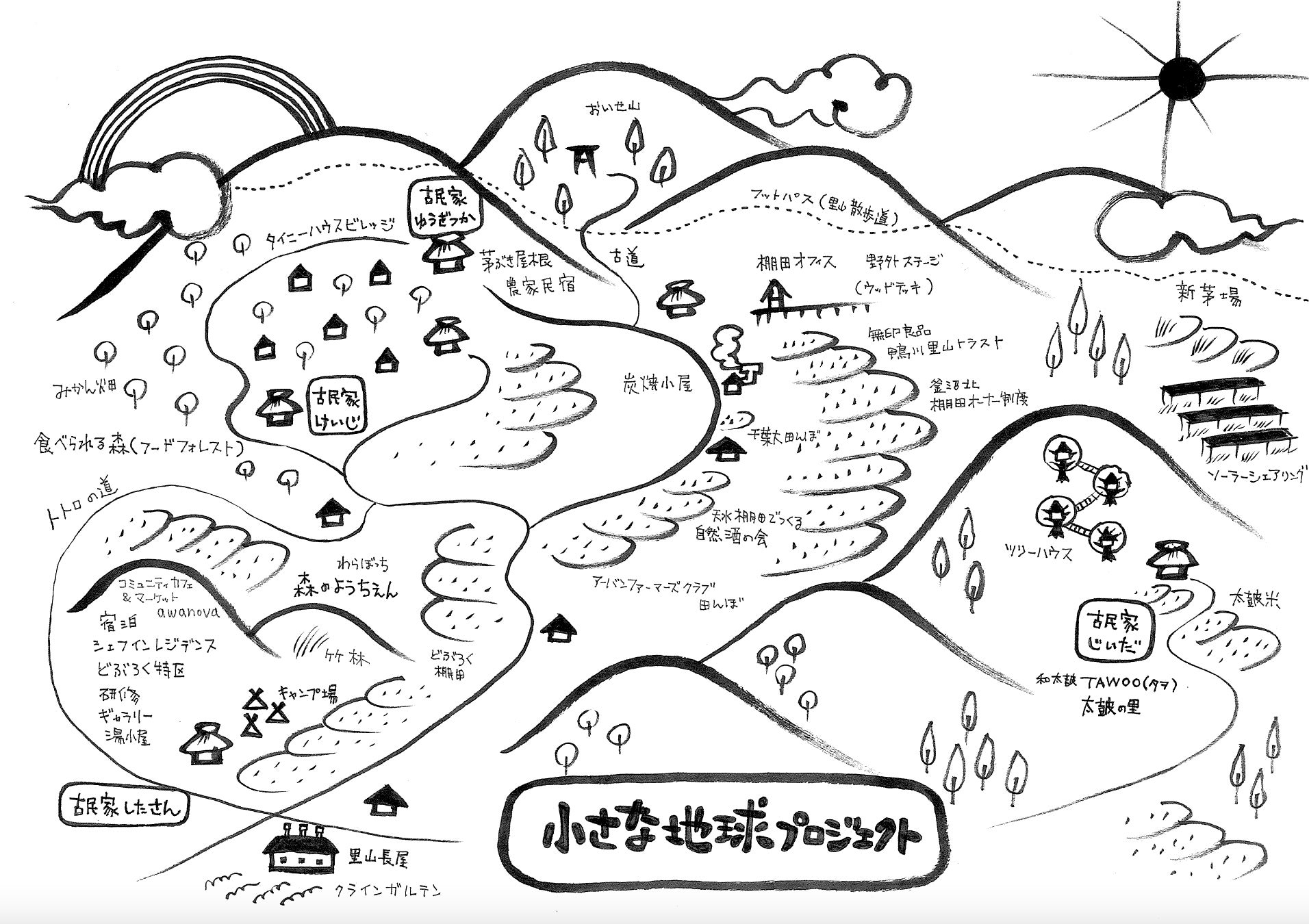 茅葺きを再生すると同時に3軒の空き家も引き継ぎ、暮らしと社会に地球の循環を表現する「小さな地球」プロジェクトを始めることへ発展し、2軒の空き家は今まで棚田に通っていた方が移住を決め、もう1軒の空き家は農地と山林を含む広大な土地ごと共同購入し、みんなのコモンズ/共有財産とすることにしました。