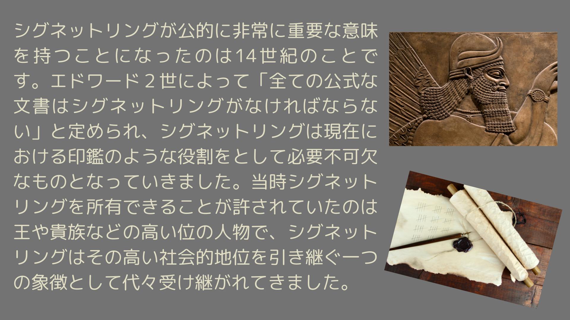 エジプトが発祥のシグネットリングですが、英国紳士に今も愛されているのは、「紳士は 控えめで実用性のある宝飾品以外は身に着けない」という思想につながっているからなのでしょう。