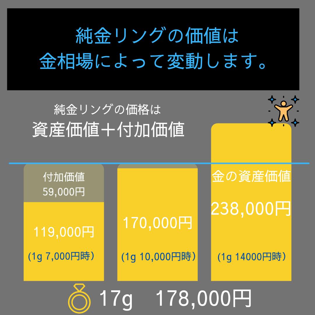 金相場を見ながら「純金リングの資産価値が購入価格を上回るかもしれない!」というワクワクも楽しめます。(もちろんその間に付加価値も楽しんでください!)