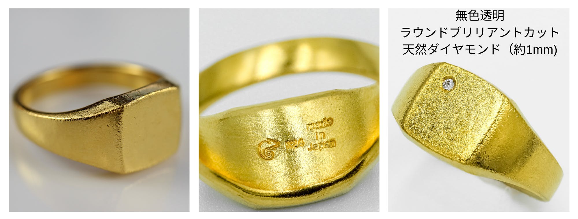 シンプルながら存在感を放つ重厚な純金シグネットリング。シンプルタイプに加え、天然ダイヤモンド付き、図柄付きの3種類ご用意しました。