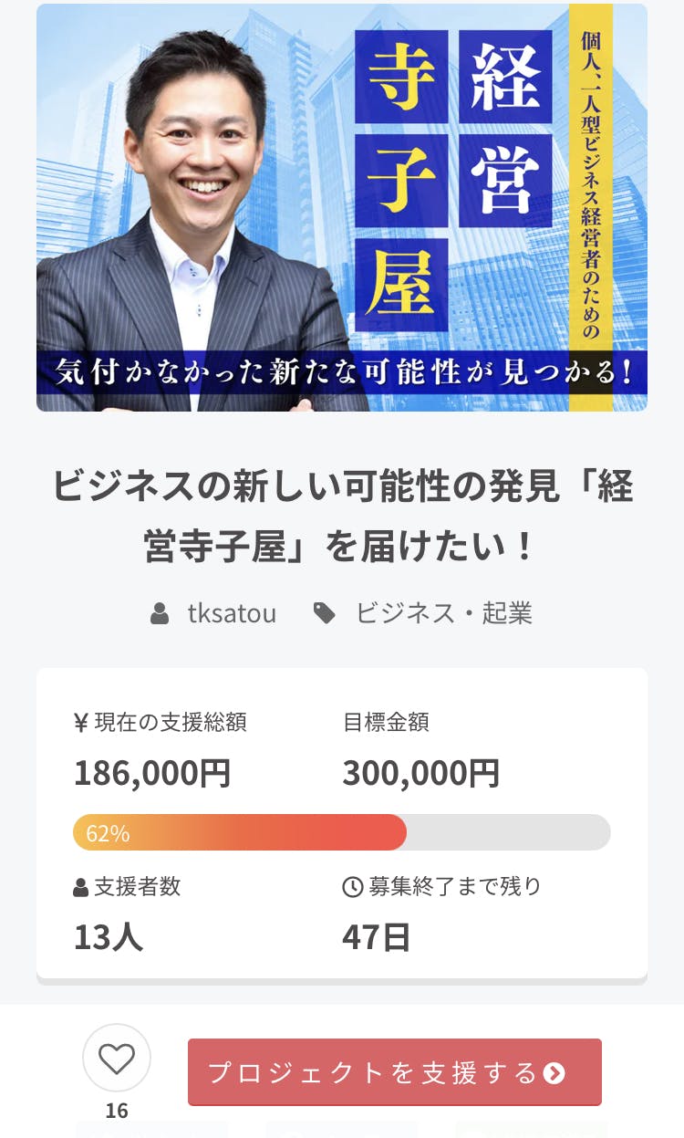2021/10/29 21:30たくさんの応援とご支援をありがとうございます!今朝8時から始まったクラウドファンディング。たくさんの応援をいただき、目標まで62%達成ができました!まだまだ困っている経営者さんに届けていきたいと思いますので、引き続きよろしくお願いいたします。感謝を込めて。経営者寺子屋塾長 佐藤志憲 もっと見る