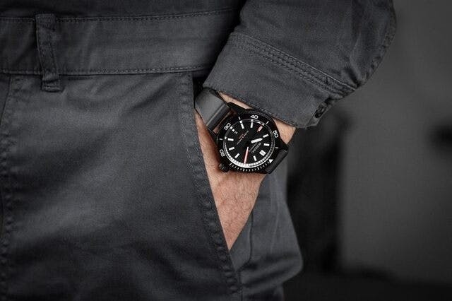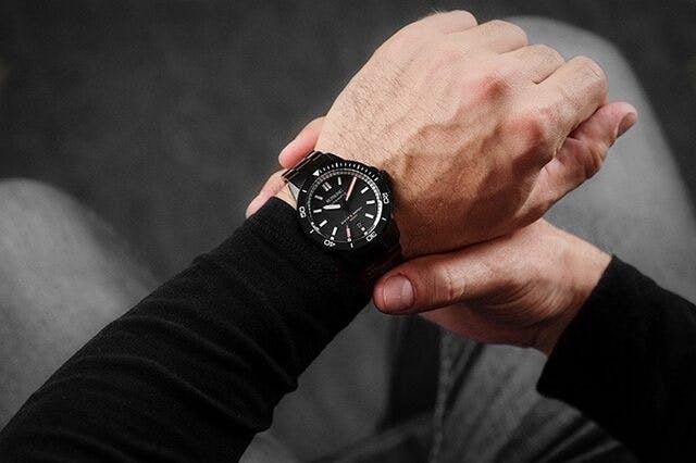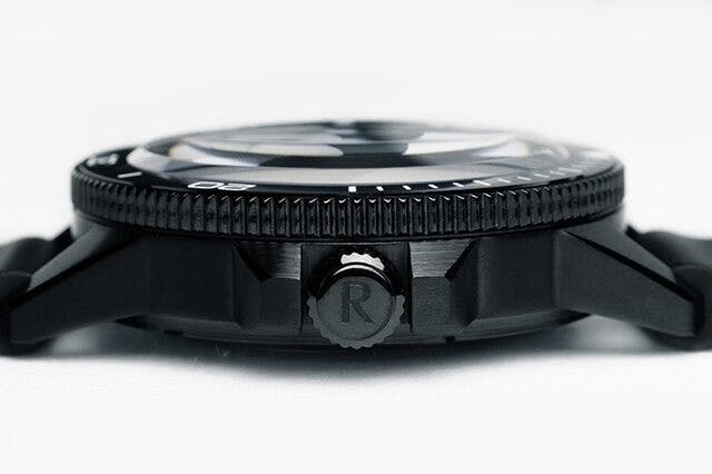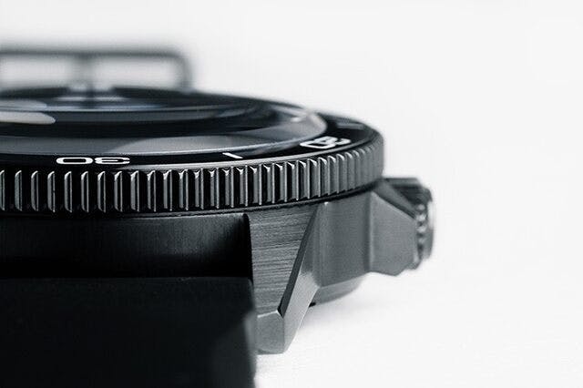 ハイコントラストのホワイトチャプターリング(個々の分マーカー付き)とブランドがマットブラックの文字盤にパッド印刷されています。
