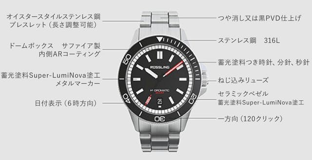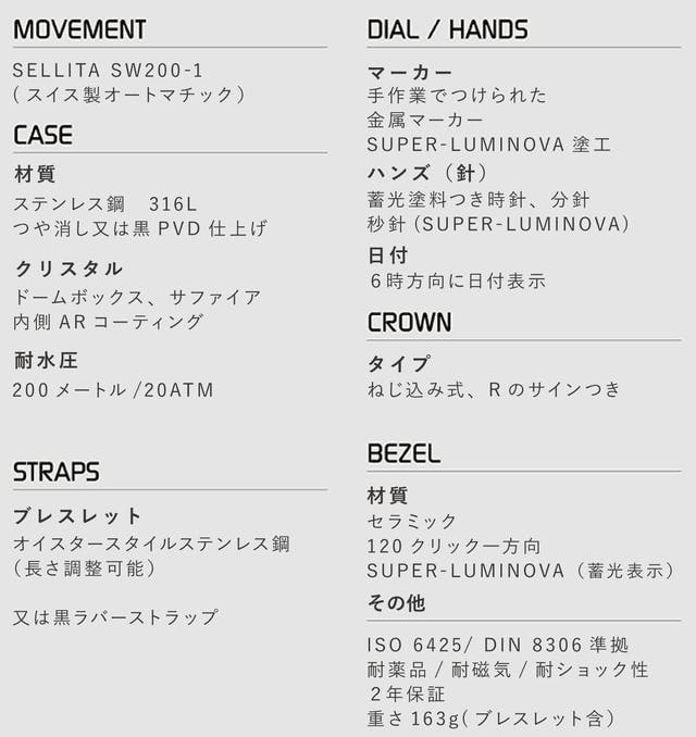 主な規格内容は(1)ダイビング中の見通しの悪い状態でも文字盤とベゼルが読みやすいこと。(2)耐水性(塩水含む)を有すること。(3)全体的な堅牢性(耐衝撃性、耐熱性、耐薬品性、ブレスレットの引っ張りテスト)に優れること。