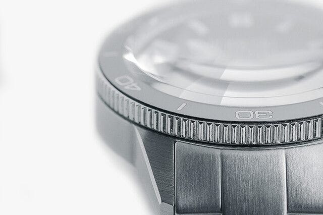60分計ベゼルは、ダイバーズウォッチの国際規格ISOとドイツ工業規格DIN仕様に従って一方向(120クリック)。