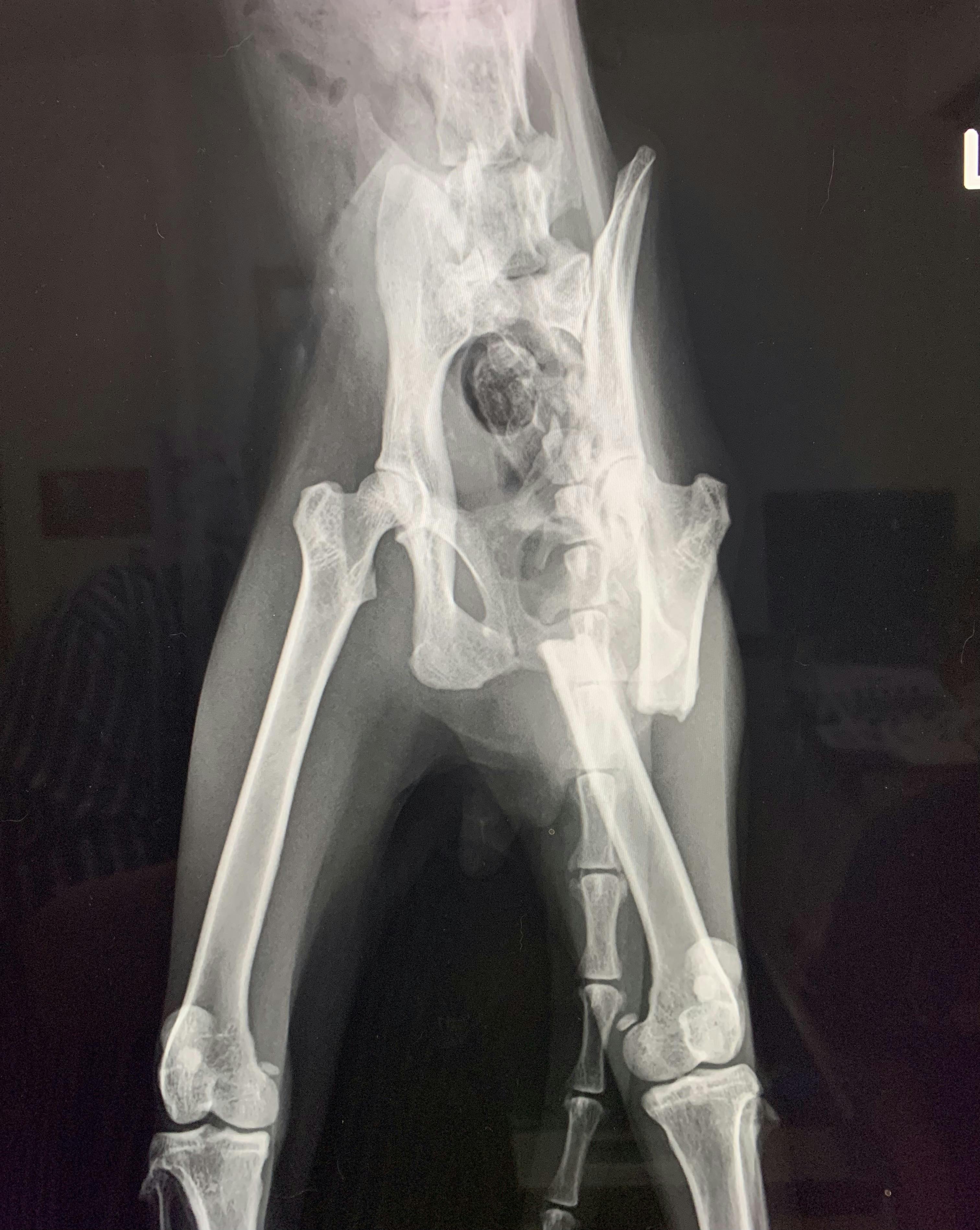 翌朝、動物病院での診断は、左大腿部の骨折!しかも骨折から数ヶ月が経過しており、それを補うための筋肉が発達したせいで、骨折した部分が筋肉により引っ張られ、左右に離れていました。このまま放置を続ければ左足の膝が逆向きになり重度の障害が残る大変な状況であることがわかりました。また、推定3歳の雄猫ですが、体重はわずか2キロしかありませんでした。