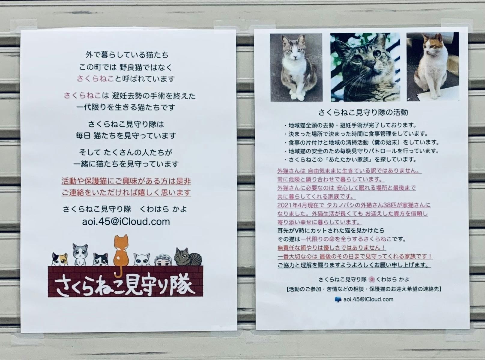 置き餌や、無責任な餌やりが、苦情につながり猫たちの立場を悪くしてしまうことや、去勢避妊の大切さ、さくらねこについてまとめたチラシを商店街の店頭や町の掲示板に貼らせて頂いたり、毎日の見守りパトロールで、配布も行なっています。