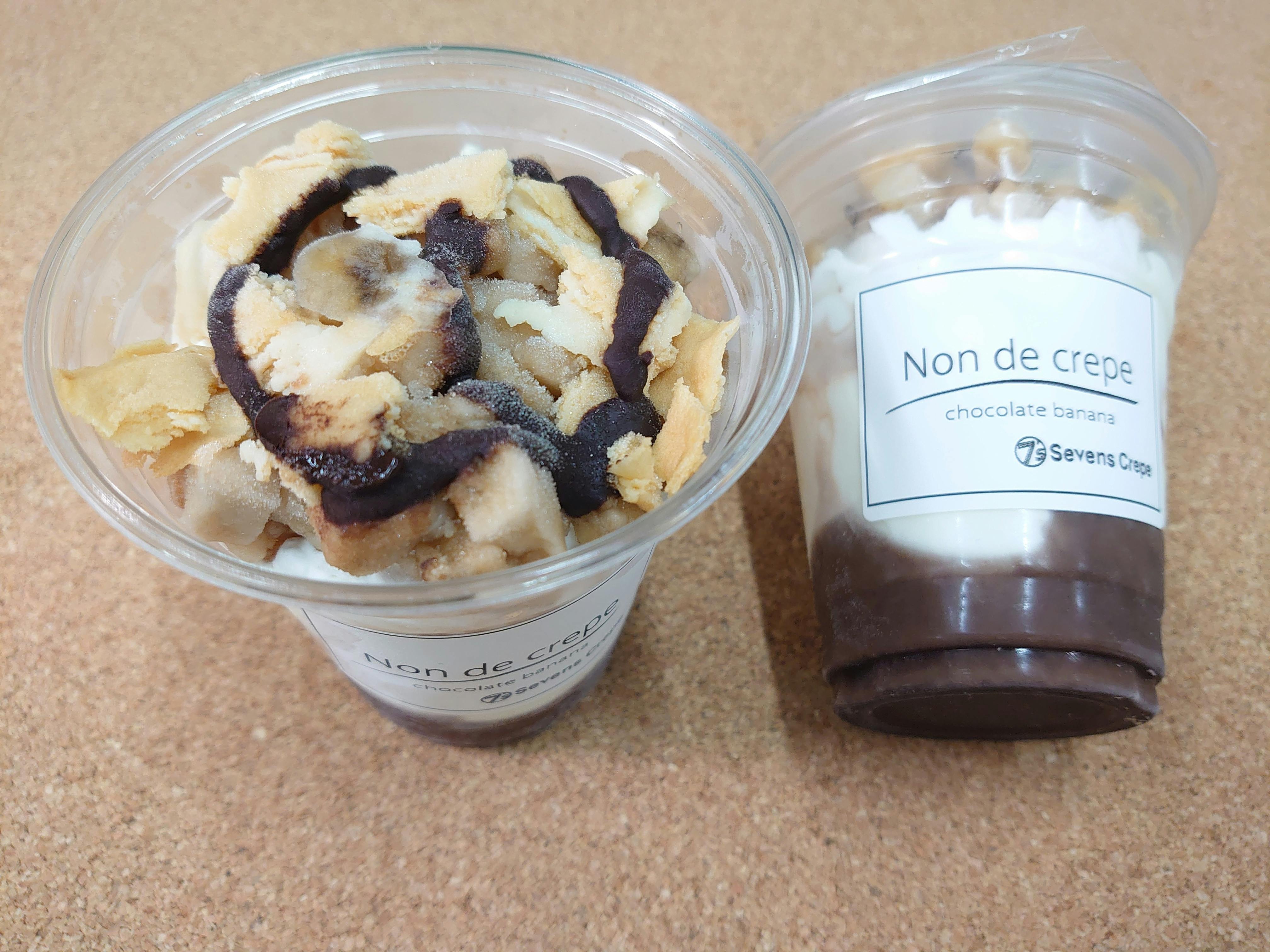 原材料:乳等を主要原料とする食品、バナナ、クレープ生地、チョコソース/乳化剤、増粘安定剤(カラギナン、グアーガム)、トレハロース、加工澱粉、香料、メタリン酸Na、着色料(カロチン)、(一部に小麦・卵・乳成分・大豆・バナナを含む)