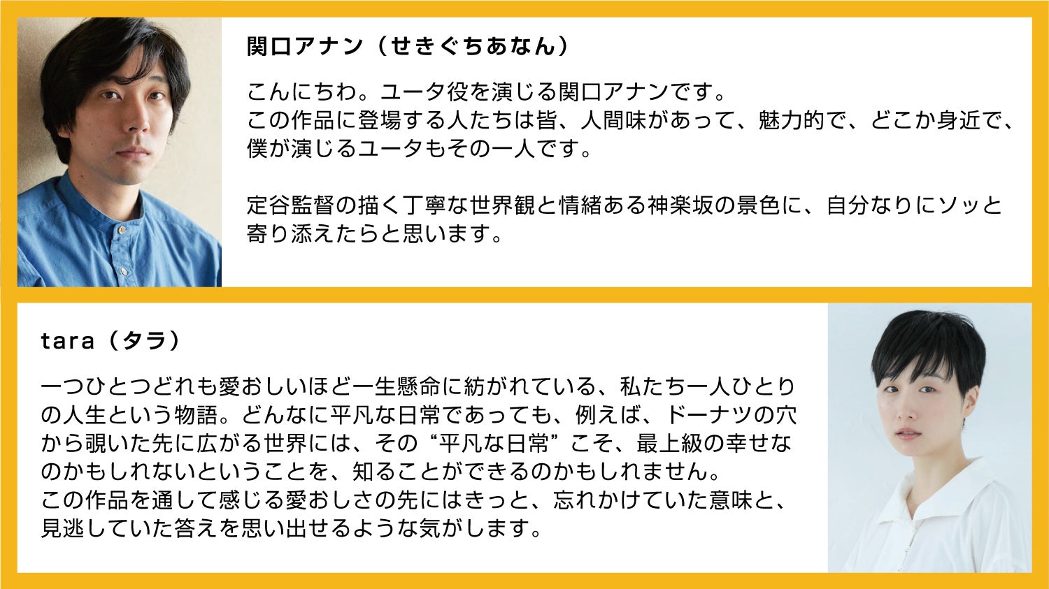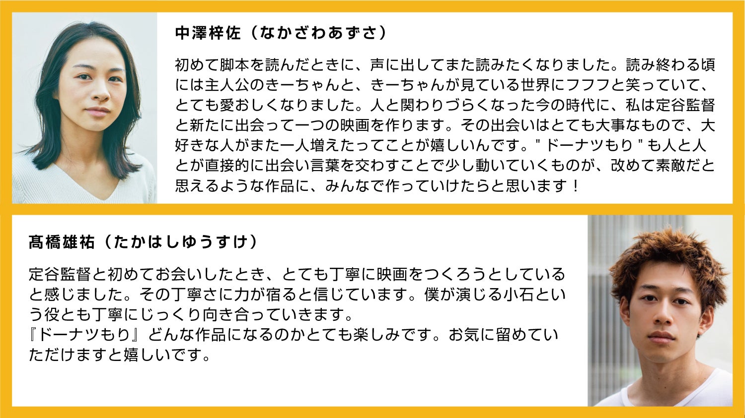 2021/11/08 18:58中澤梓佐撮影期間は濃密すぎて、あっという間で、終わっていくことがとても寂しかったです。と、同時に、チームみんなの力が合わさった完成が待ち遠しい。そんな時間を今、過ごしています。きっと、私が現場で感じたみんなの力と愛おしさが詰まりまくっているはず。一緒に完成を楽しみにお待ちいただければ!!足立智充本当に自分の店だと思うくらい居心地よく現場に居れました。監督の食い入るようにモニターを観る姿(時折肩を震わせて)かっこよかったです!髙橋雄祐いつも和やかでとても楽しい撮影でした。この作品に関わる事ができて良かったです!tara撮影に入る前、実際お店に立って接客をしたりドーナツを作ってみたり…丁寧に、大切に、キャスト・スタッフ皆で作りあげた作品の空気はとてもあたたかく、そのあたたかさを、スクリーンを通して早くみなさんへお届けしたいです。関口アナン登場人物みんなが愛おしい作品になってると思います。神楽坂の景色と共にお楽しみ頂けたら幸いです。仁科かりん温かいスタッフの方々、共演者の方々のおかげでとってものびのびと撮影ができています!ちひろはお店のお客さんとして出演してますが、私自身、このお店で働きたいななんて思ってしまうような、そんな所です。完成をお楽しみに!安藤聖連日早朝からの撮影で疲れているはずなのに、毎日ちゃんとお洒落して現場に来る監督に、いい女ー!と密かに思ってました。こちらのテンションはそれだけで上がったりしますから。ありがたかったです! もっと見る