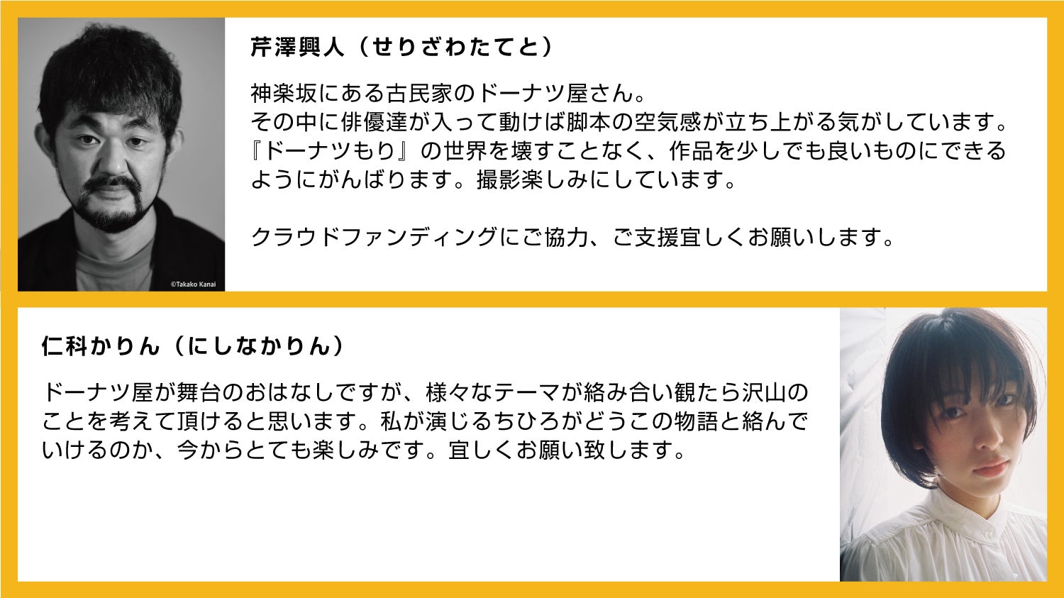 2021/11/10 06:57今日でクラウドファンディングも終わりです。ギリギリセーフで芹澤興人さんからのコメントが届きました。芹澤興人あるシーンの段取りの時、監督から「ここ、ちょっと面白い感じがいいです」と言われ「じゃあ、ドーナツ持ってこんな感じでクルっと回ってみるとかどうですか?」とやってみたところ「そうしましょう!」となりました。セッティングが始まって、近くで待っていると出演兼演出部の関口アナンさんが、ドーナツを持って、夜の赤城神社の鳥居の前をクルクルしている。かなりバカっぽくて面白い。「どうか関口さんにバチが当たりませんように」と祈ってみる。役者の提案を受け入れて、時間のない中でも焦らずに良いものを作ろうという監督、スタッフの方々の姿勢が嬉しかったです。内心は「あー僕がドーナツ出すって言ったせいだなぁ、めんどくさい俳優って思われたかなぁ。大丈夫かなぁ、巻いてたのに、時間押したかなぁ…」と結構不安でした。人の仕事を待つことができる人達が揃っている現場は凄く好きです。10月下旬、寒空の下、赤城神社の鳥居の前でドーナツを持ってクルクルしている男を目撃した方。あれは僕です。きっと神楽坂に来る度にこの夜のことは思い出すでしょう。何パターンか撮影をしたのでどのカットが使われるのかは完成してのお楽しみにします。とても懐の深い現場に参加できて幸せでした。完成楽しみにしています。歩き方ひとつ、振り向き方ひとつ、丁寧にディスカッションしていきます。ちひろ役の仁科かりんさん、勘が良く、でも、どこか抜けていてGOODです!OKが出てFIVE ME FIVEしている仁科さんとtaraさん。日に日にいい関係性を築く、チームもり。赤城神社のナイトシーン。DPの木津さん、「監督出れば?」という一言で監督もどこかで出演です。前回でもお届けしたキャスト陣のコメントからも分かる通り、撮影現場は温かく、それぞれのかけがえのない人生の一部になったのかな?と思いました。「こういう言葉を使えば伝わるのかな?」「こういう声色で言うと和らぐのかな?」と初めての映画の現場で学ぶことが多く感慨深い期間でした。とあるスタッフから言われた言葉です。「監督は言葉を操る仕事である」とある先輩から言われた言葉です。「愛を持って仕事をしろ」ものづくりにおいて、生きてきた時間、見て聞いて感じてきたもの、つまりは人間が映るのものであると信じています。この映画はそんな人間性の集合体でありたい。完成までまだ時間がかかりますが、来年の劇場公開を心待ちにしていただければと思います。監督より もっと見る