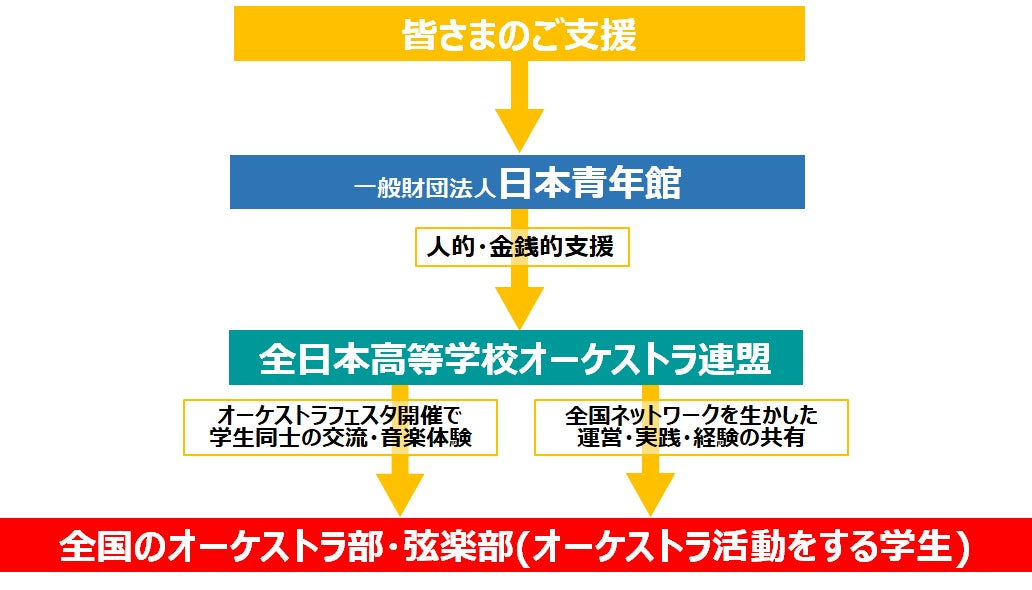 一般財団法人日本青年館はホテルやホールを運営し自分達で生み出した収益の一部を使って社会に役立てるべく様々な公益活動を行っており、全日本高等学校オーケストラ連盟の発足以来、人的・金銭的支援を継続しながらこれまで26年間、二人三脚で様々な高校オーケストラ事業を運営してまいりました。しかし、新型コロナウイルス感染拡大の影響で経営は大変厳しく、さらに主催団体への助成金の打ち切り等も重なり、公益活動継続が困難な状況にあります。