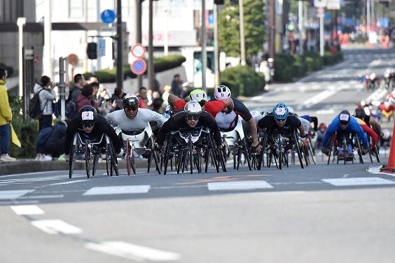 公道コース等を「レーサー」と呼ばれる競技用車いすに乗り、腕の力だけで42.195㎞を、トップ選手はなんと1時間20分余りで走り抜く、迫力満点のスポーツです。