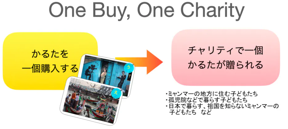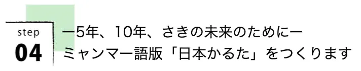 ミャンマーの若者や子どもたちに、日本の暮らし、風習、食文化などを伝えるために、ミャンマー語で「日本かるた」を作り、ミャンマーの子どもたちに渡したいと考えています。将来的には、「日本でかるたが1個売れたら、ミャンマーにかるたを1個チャリティで贈る」ことを目標にしています。