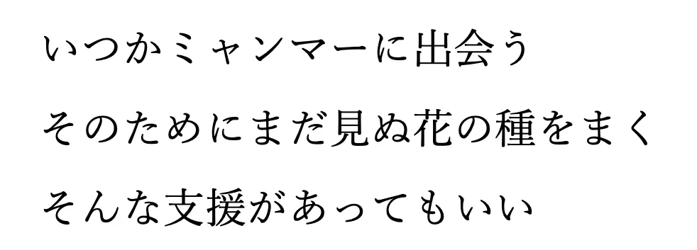 私の知るミャンマーには、穏やかな日常がありました。いま平和と民主主義のために戦っている人たちは、家族とご飯を食べたり、恋をしたり、仕事をしたり、そんな当たり前の日常を生きていた人たちです。そして、突然その日常を奪われた人たちなのです。