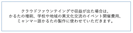 今回のご支援で、私たちは500セットのかるたを製作します。ASEAN諸国の中でも、日本の方に馴染みのない、近くて遠い国ミャンマーですが、かるたを通して、日本中の中高生にミャンマーを知ってもらえるよう、1000個、10000個と製作していきたいです。その最初の1つを、是非手に入れてください!