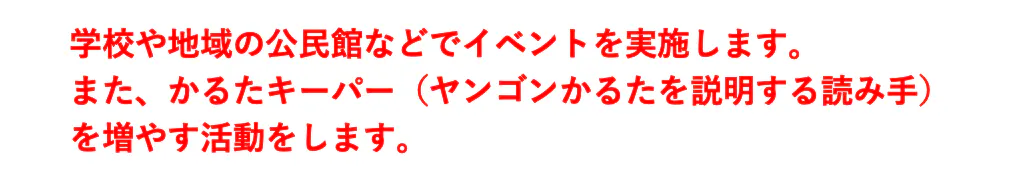 私たちは、いま起きている世界の問題について学んだり議論したりする機会はほとんどありません。学校で過ごす時間が長いほど、社会の問題から切り離されてしまうように感じます。世界の問題を「自分ごと」として考えるために、ヤンゴンかるたを地域や、学校の教育の中で取り入れていただけるような活動をしていきます。ICT機器を利用し、写真や動画によるライブ感のある説明を加えることで、遠く離れた場所で繋がり、オンラインでもかるたを楽しめる仕掛けを作ろうとしています。