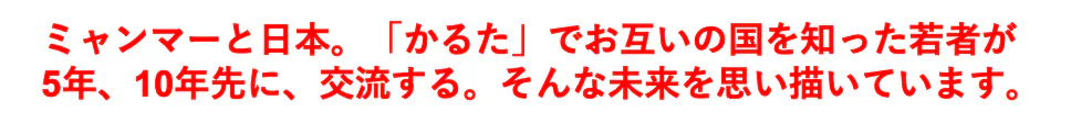 百聞は一見にしかずかるたでミャンマーを伝えることで、「ミャンマーにいつか行ってみたいな」「ミャンマー語を勉強してみようかな」「ミャンマー料理を食べてみよう」そんなきっかけを生み出し続けたい。