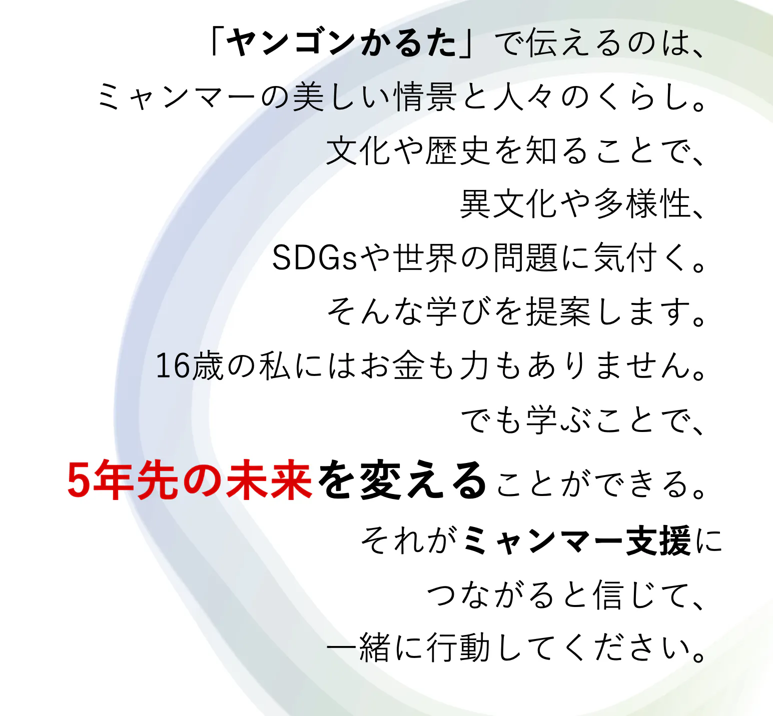 ミャンマーを知ることで世界が見えてくる。そして日本の素晴らしさにも気づく。そんな学びを続ける先に、日本とミャンマーの未来が繋がっていく。それが、私たち若者にできるミャンマーへの支援です。