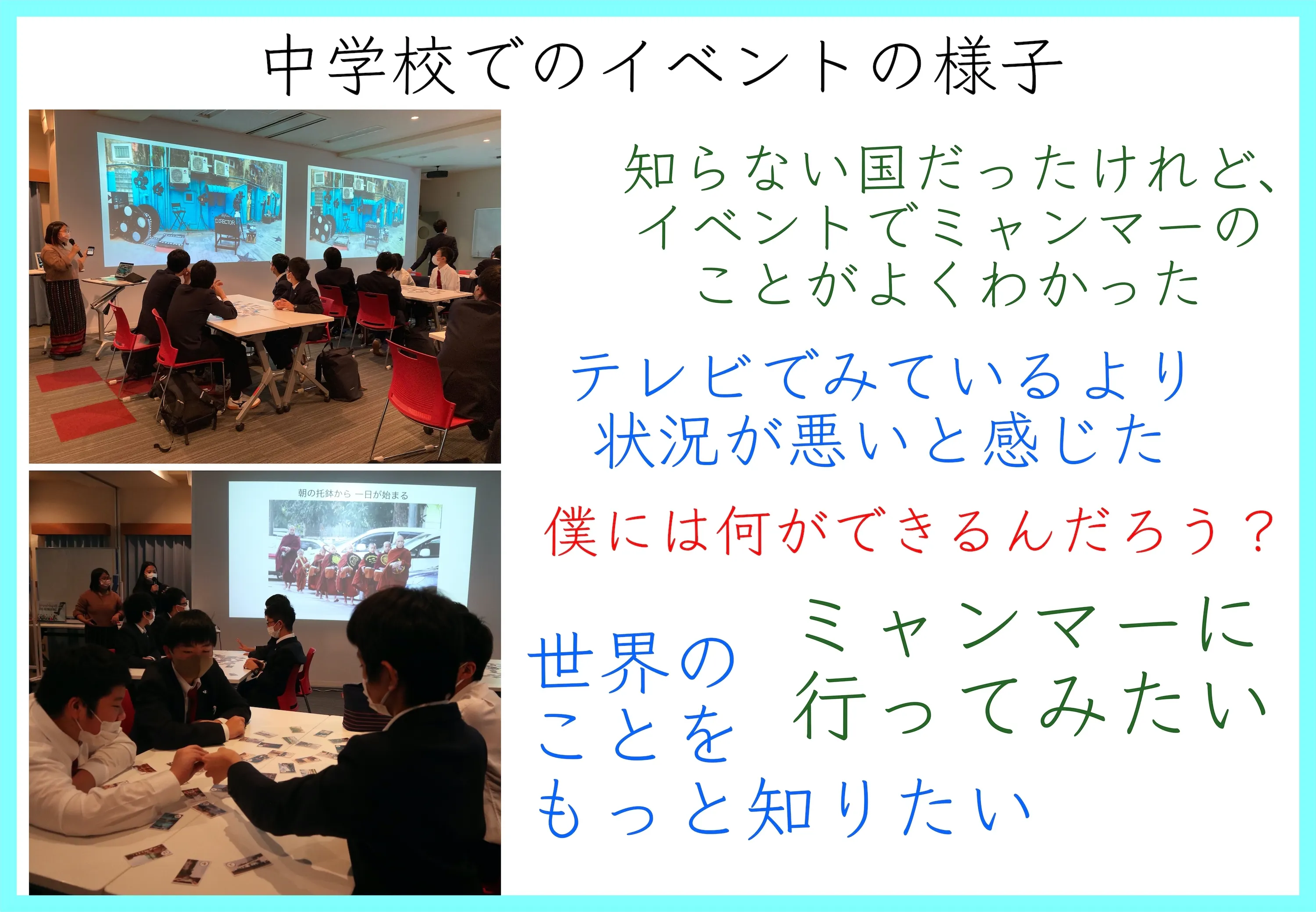 まずはミャンマーの現状を伝えること、そして日本とミャンマーのポジティブな未来を描くことが大切だと思うから、学校や地域でかるたイベントを実施します。東京都の男子校での初イベントでは、参加した中学生と一緒に「国際社会の中で自分たちにできることは何か」を考えました。かるたでは盛り上がり、講師の話を真剣に聞く様子に、ミャンマーのことを伝えていきたいと、改めて強く思いました。
