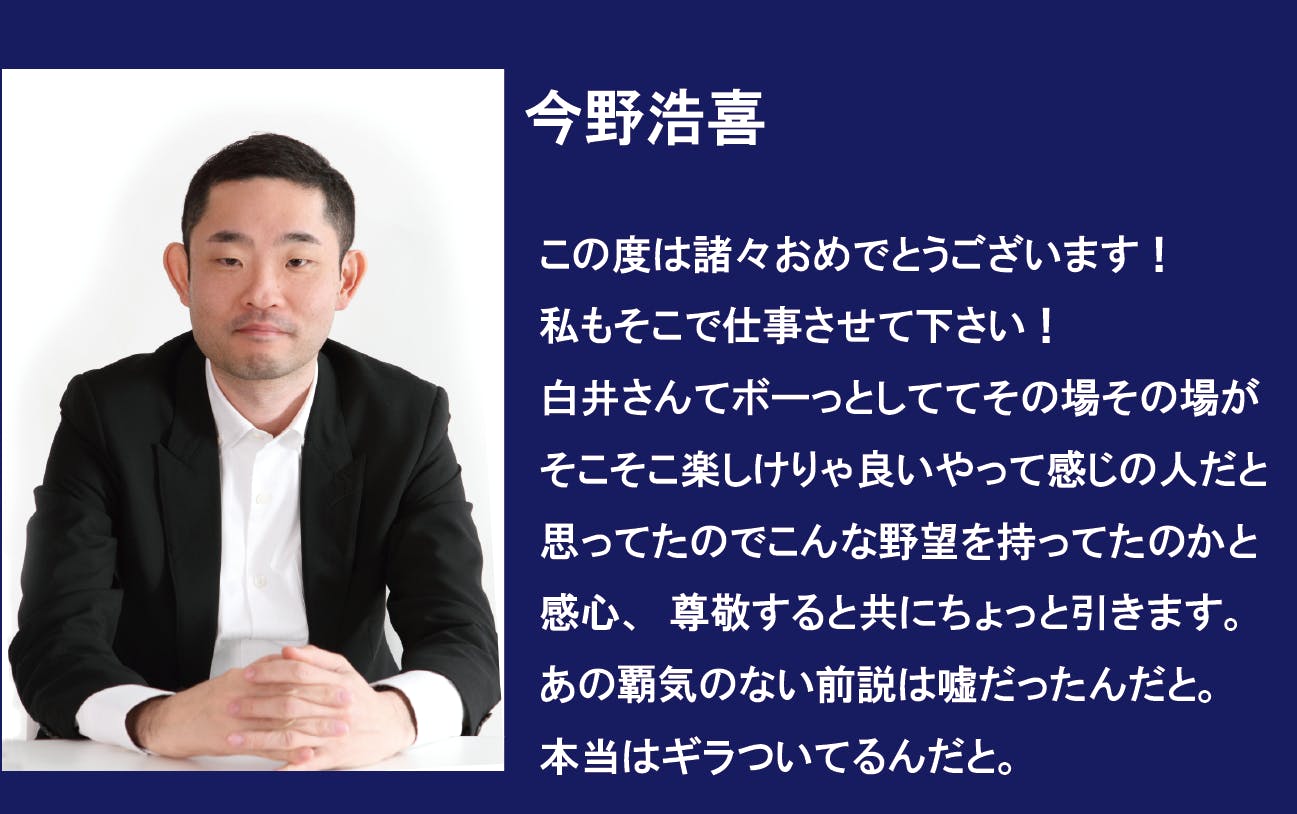 [役員]代表取締役社長 CEO 白井絢介 / 代表取締役副社長 COO 野口結生