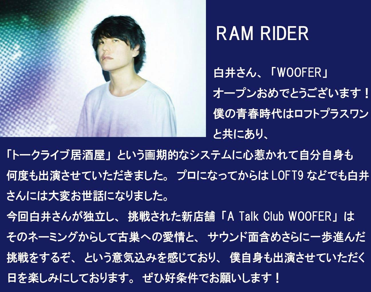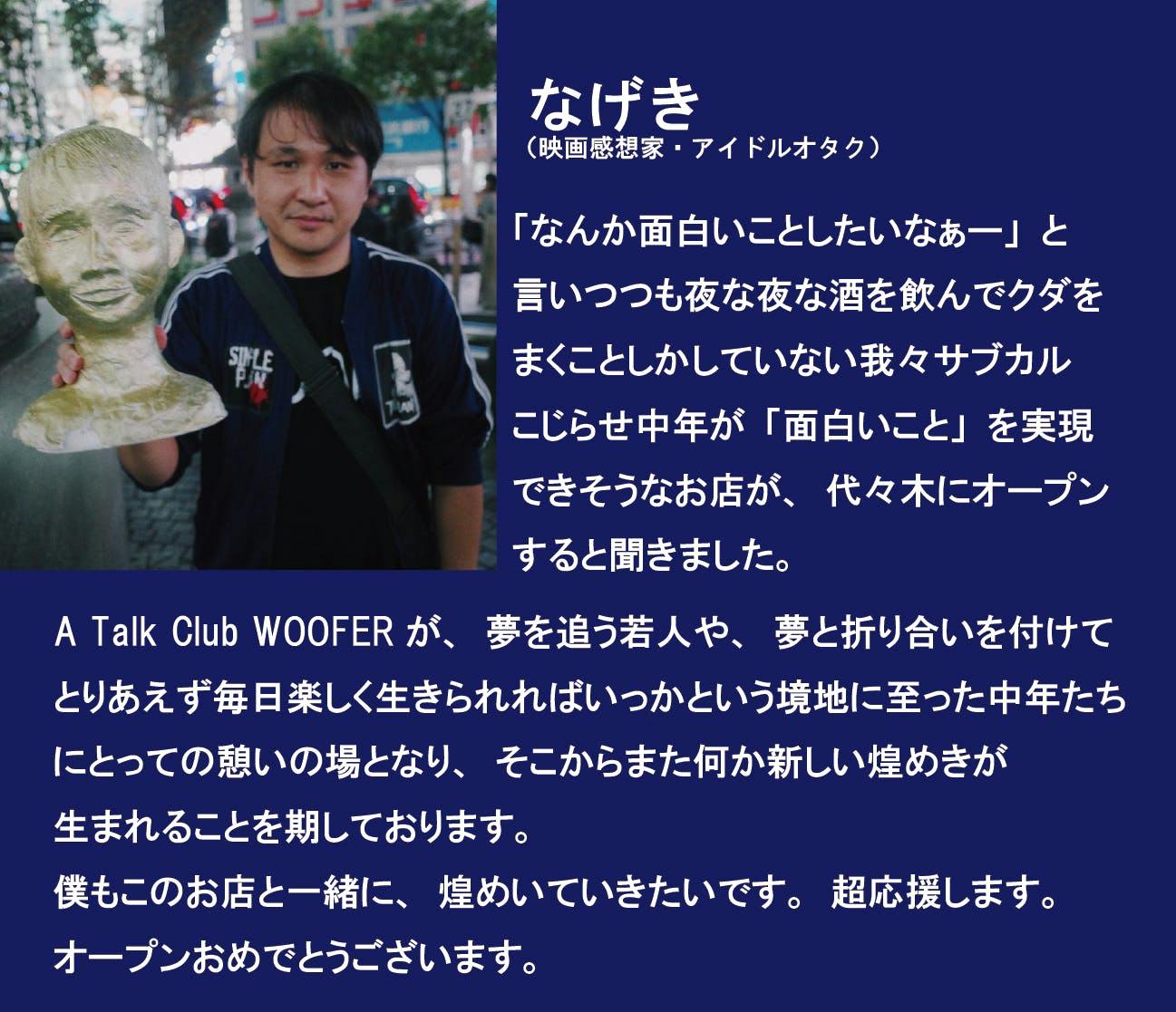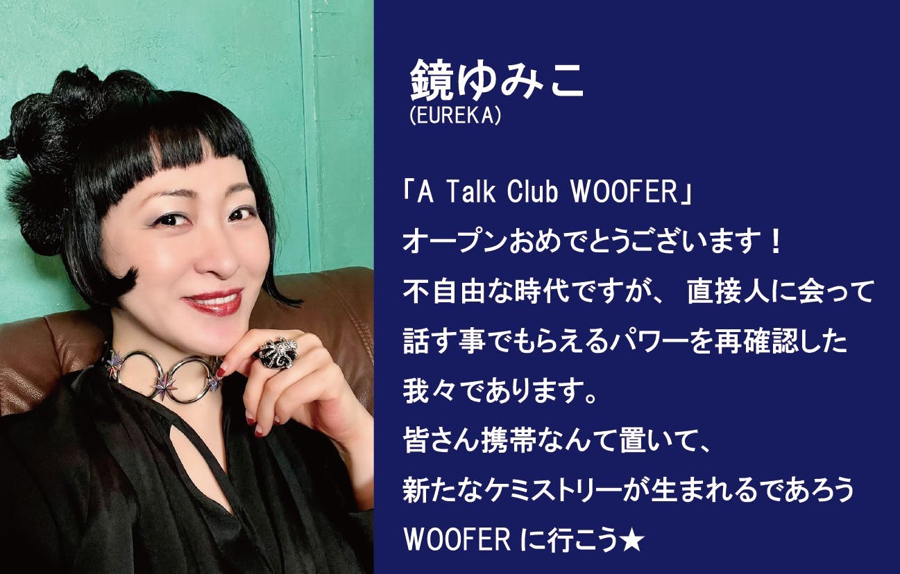 A Talk Club WOOFERを盛り上げてくれた出演者が羽ばたいて人気者になり、毎日テレビやラジオ、ネットなどで活躍している。そんな未来を楽しみにしています。また仕事が忙しかったり、ネガティブな事があったり、ご来場いただく皆さんもそれぞれ大変な日々だと思います。そんな時にこそイベントで、ランチで、昼飲みで、BARで、それぞれの時間を楽しんでもらい、A Talk Club WOOFERがお客さんを少しでも笑顔の未来へ連れて行ければ最高です。