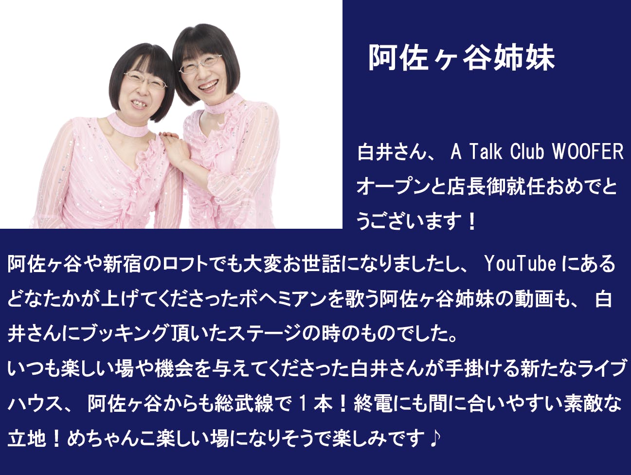 阿佐ヶ谷姉妹からA Talk Club WOOFERオープンお祝いコメントいただきました!