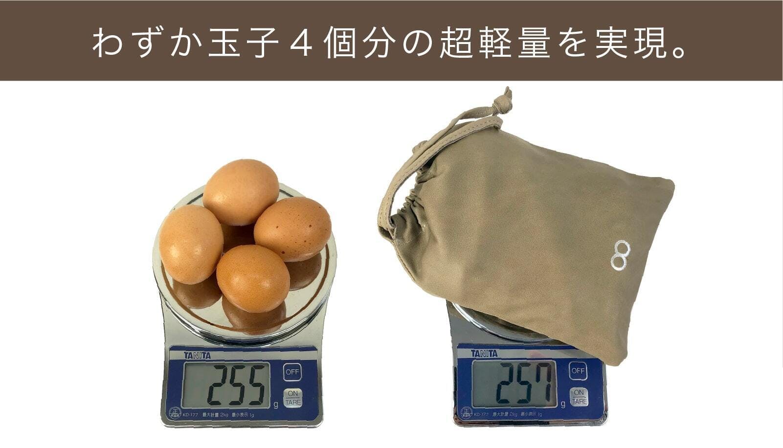 これにより、バッグ全体で257g、わずか玉子4個分という