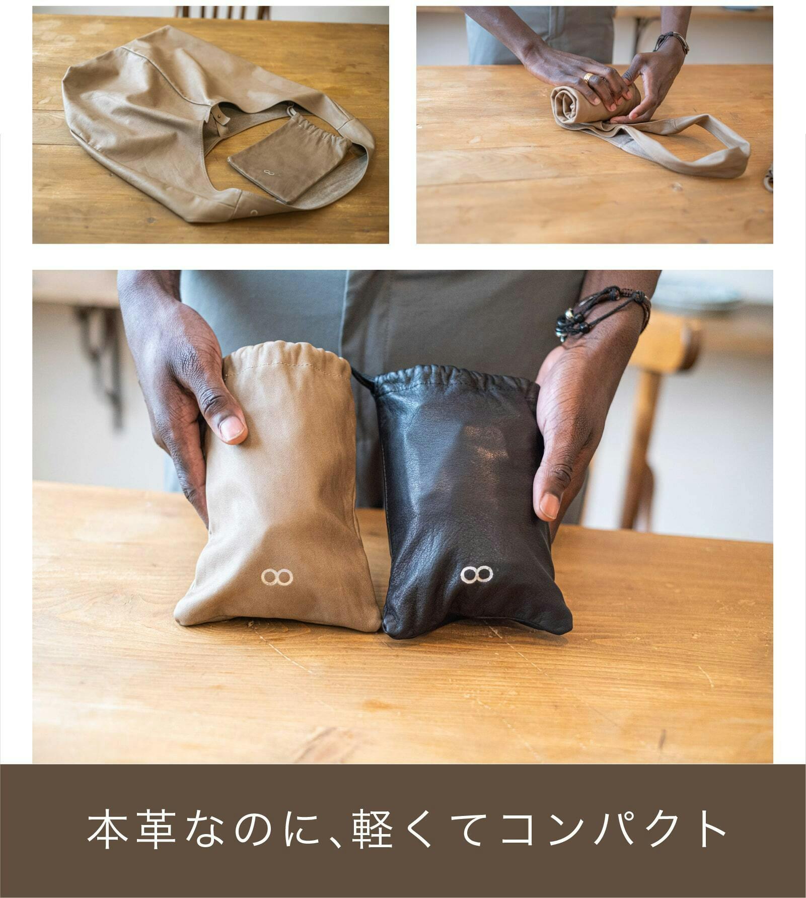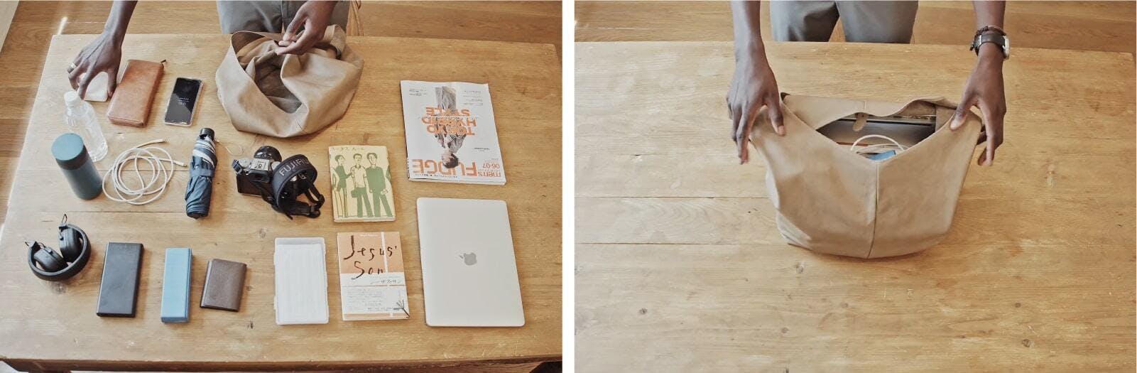 手のひらサイズでありながら、広げると普段使いのトートのようにたっぷり収納できます。
