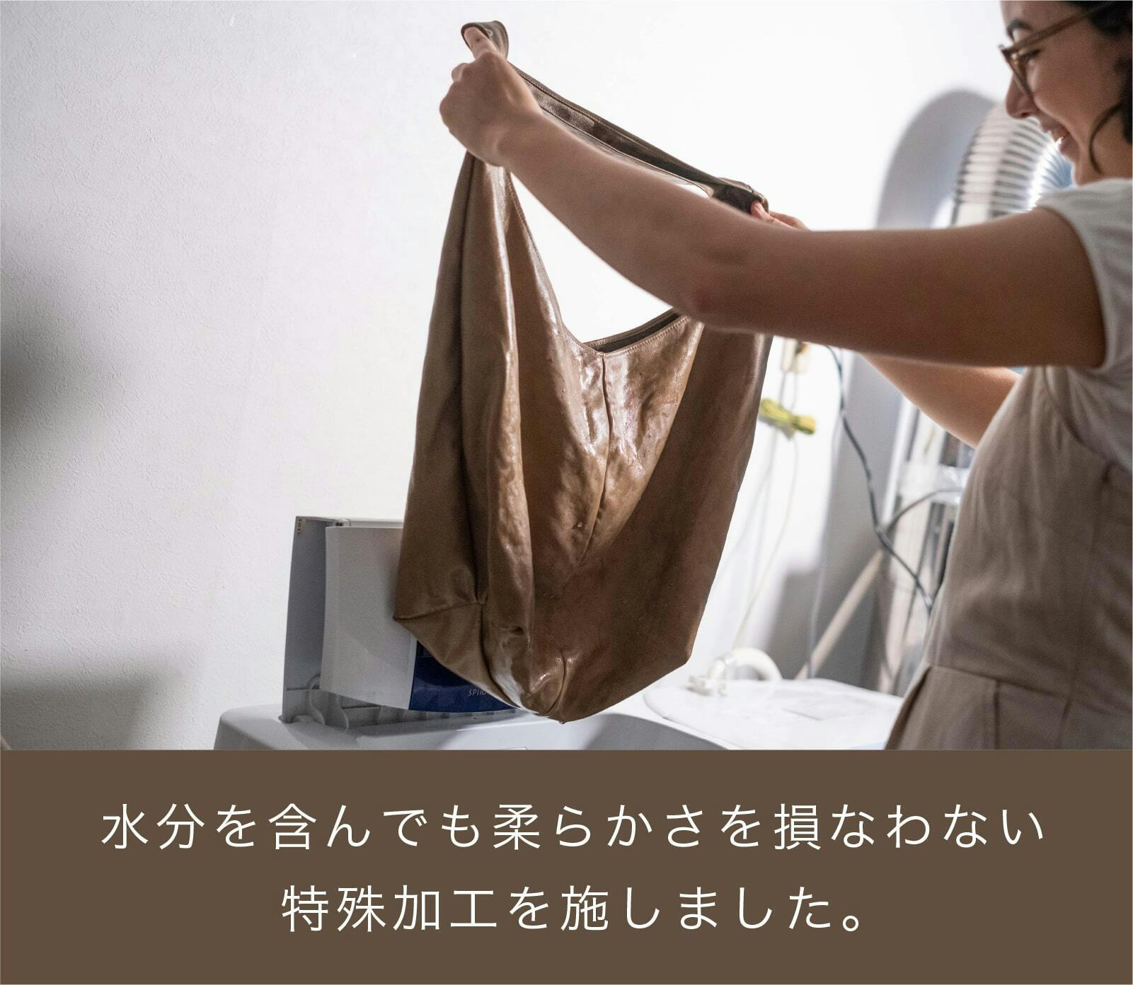 今回開発した「ウォッシャブルレザー」は、水分を含んでも柔らかさを損なわない特殊な加工を施しています。