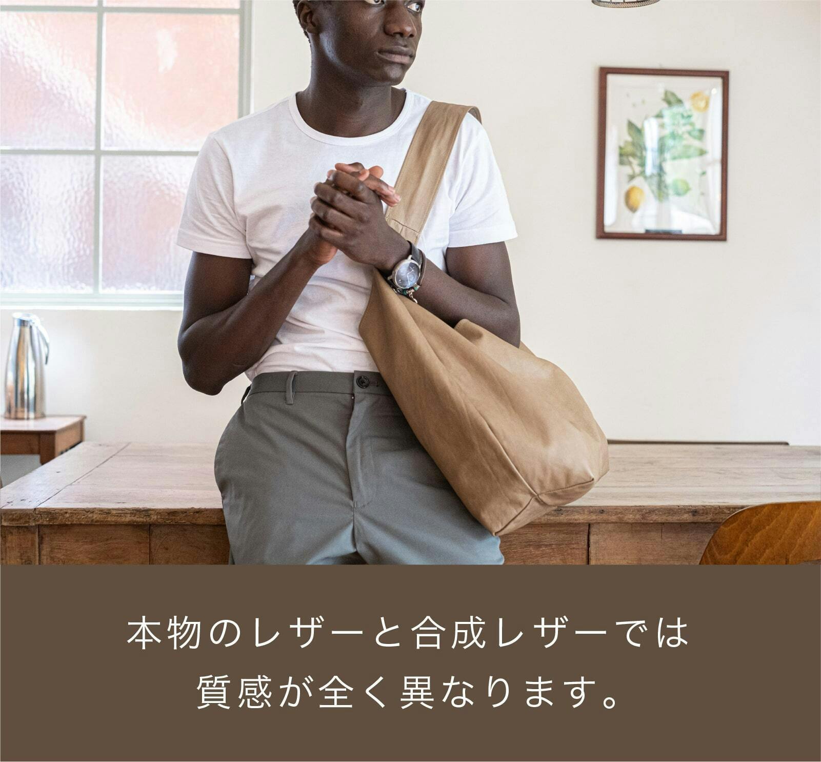 本物のレザーと合成レザーでは質感が全く異なります。