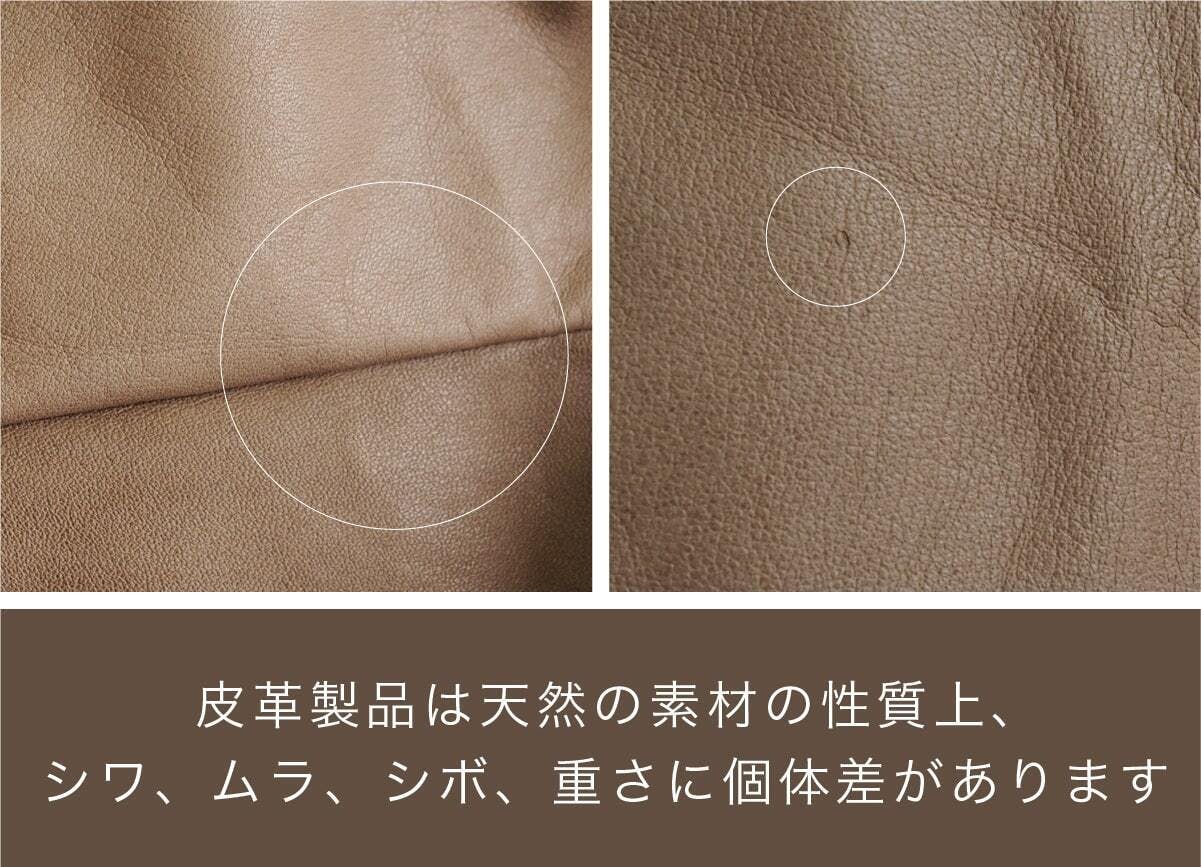 皮革製品は天然の素材の性質上、シワ、ムラ、シボ、重さに個体差がございます。